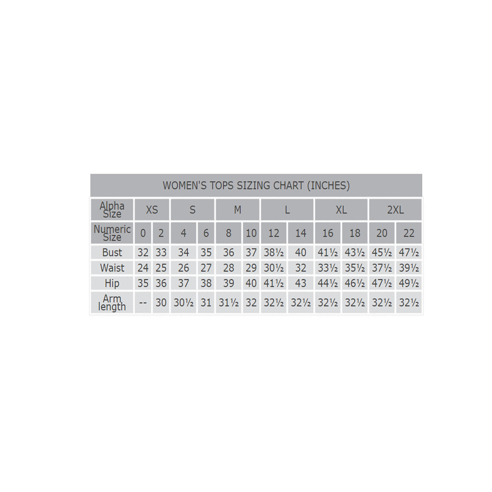 | Alpha Size | XS | S | M | L | XL | 2XL | ||||||