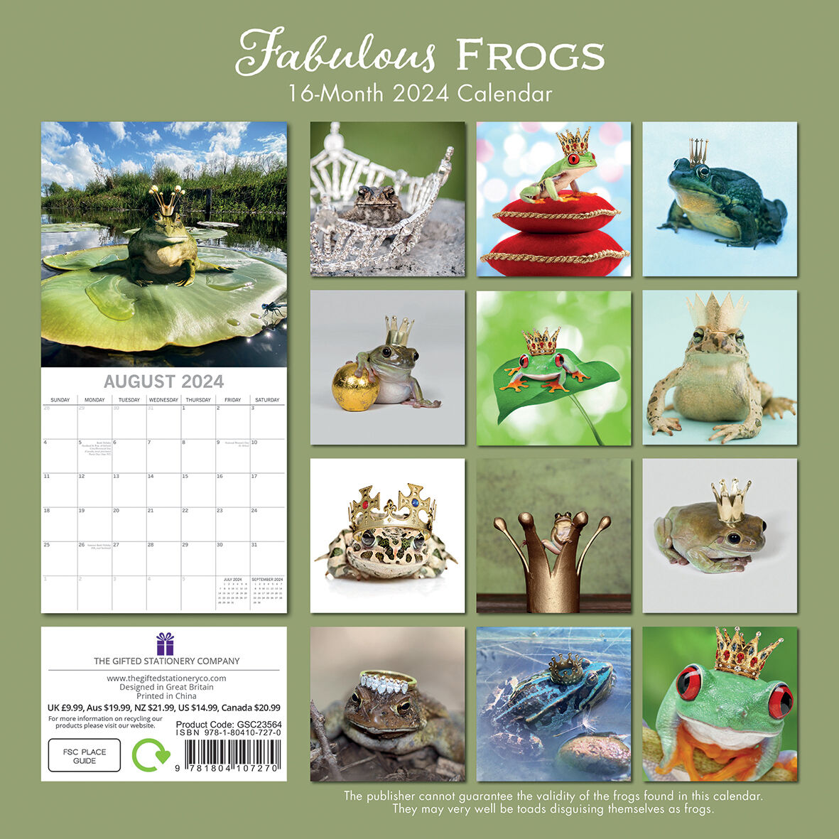 Leap into 2024 with our "Fabulous Frogs" calendar. Each page showcases these delightful amphibians in whimsical and unexpected scenarios. A perfect blend of nature and humor, this calendar is sure to brighten your day! Brand New Calendar with Beautifully design, Sealed in Original Packaging, each calendar includes a large grid running from Sunday to Saturday. Publisher: The Gifted Stationery Co. Dimensions: 30cm (w) x 30cm (h) closed; 30cm (w) x 60cm (h) opened Time Span: 16 months (January to December 2024 monthly, September to December 2023 on-a-page) 2024 Square Wall Calendar featuring beautiful colour photographed images for every month of the year. Like most Wall calendars, this one comes with: