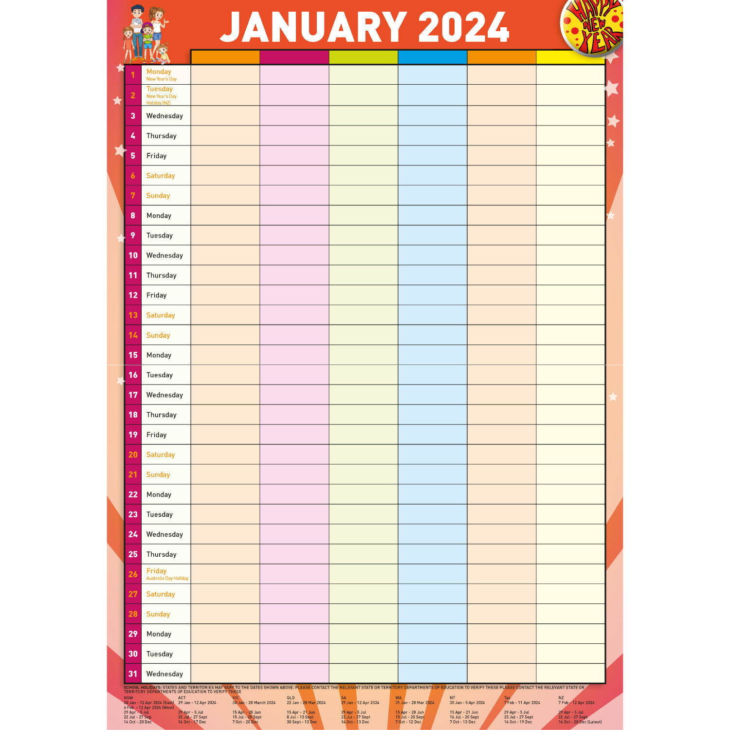 • Public Holidays, pension dates, and school terms for Australia and New Zealand are marked on the calendar.