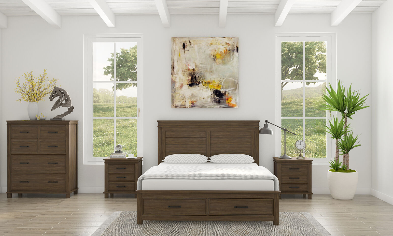 Some pieces of furniture instilled classic beauty in the bedroom. This queen bed,tallboy suite is entirely made up of such pieces of furniture.Crafted in the traditional style, the suite adorns your bedroom wonderfully. It turns it into a relaxing haven and also brings in extra storage space.The suite consists of 1 queen-size bed having 2 large storage drawers in the footboard; 1 tallboy with 6 sizable drawers; and 2 bedside tables with 3 drawers each. All the drawers have full metal extension runners and metal handles with an antiqued finish.A distinctive horizontal panelled headboard gives a sophisticated look to the bed. Further, a solid wood slat system with central support legs gives the bed great robustness. The entire furniture set is made of sustainably harvested solid pine wood. The wood is known for its amazing strength, great durability, shock-resistance, and ease of maintenance. The suite in a rustic grey finish goes well with a variety of interior decor styles, and a one-year warranty is included with the bed frame. The best part is that only the bed needs to be assembled in the entire suite.