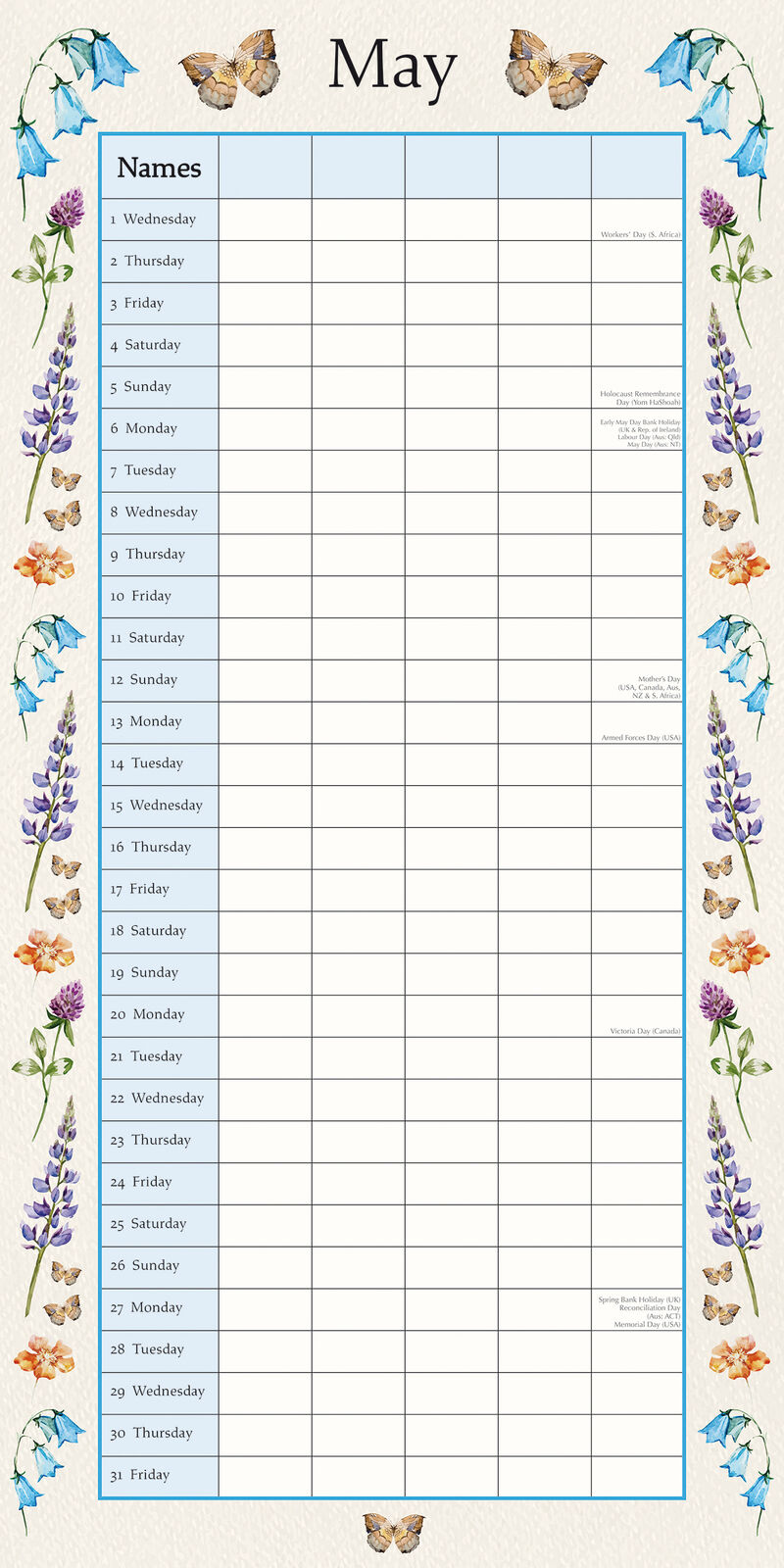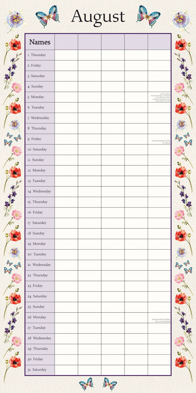 • Public Holidays and major religious dates are marked for Australia, New Zealand, UK, USA, Canada, Japan, and South Africa