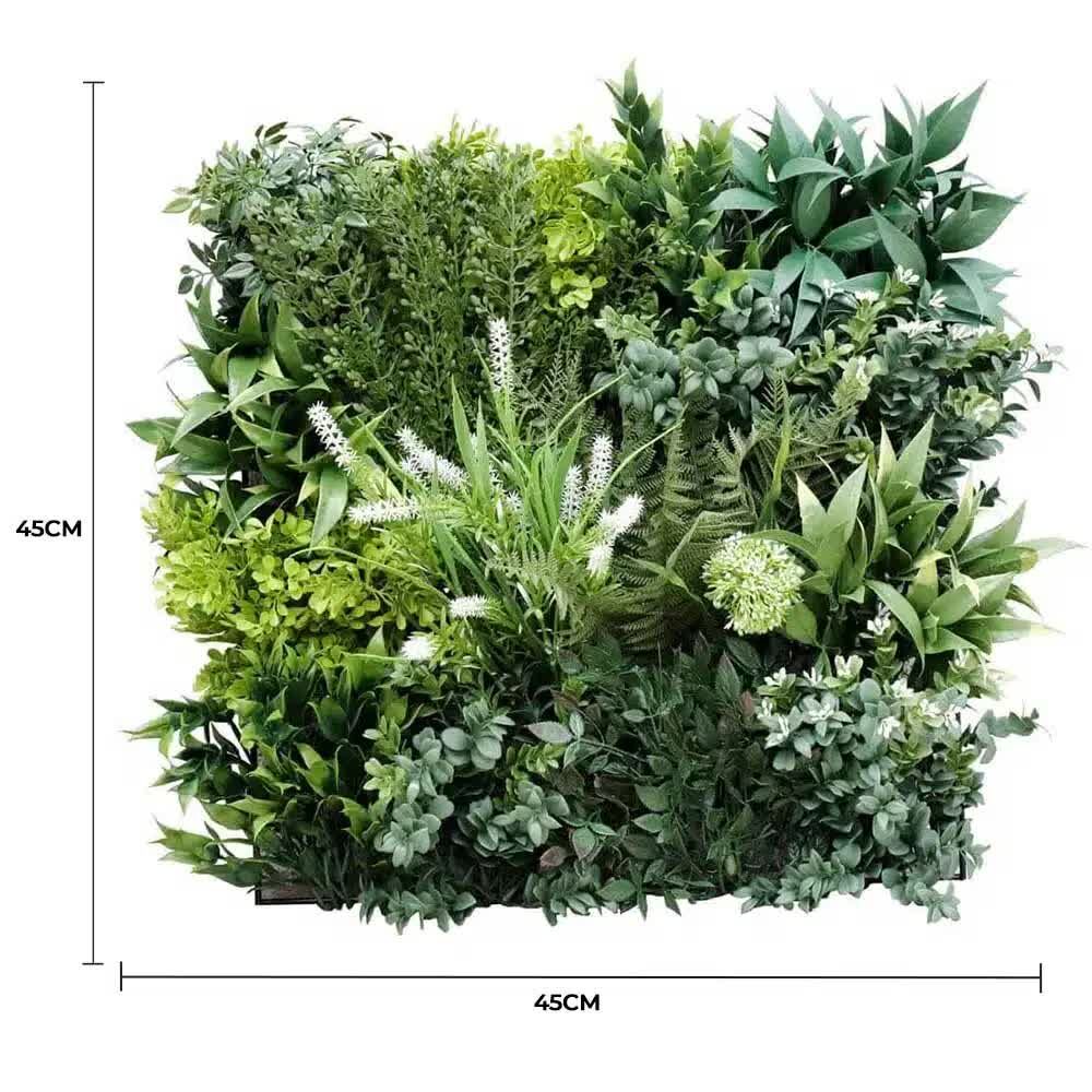 This stunning artificial living green wall panel sample has been exclusively designed to showcase our Garden of Eden premium quality designs. This flowering sensation contains 11 kinds of foliage elegantly blended together all within a 45cm by 45cm panel, providing a lush backdrop that will instantly transform your space and provide a sanctuary for the senses.