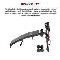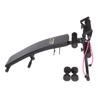 The incline sit-up bench is curved to ensure an intense core and upper body workout. The two 1.5kg dumbbells and pair of rubber cord resistance expanders will bring new strength and tone to your muscles. This must-have sit-up bench adjusts for height to enable maximum intensity and features adjustable knee, leg and foot foam roller bars to accommodate all body sizes.