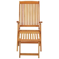 These wooden garden chairs will make a great addition to your garden, terrace or patio. Solid eucalyptus wood: Solid eucalyptus wood is a beautiful natural material. Eucalyptus wood is extremely dense and water repellent.Comfortable reclining positions: The outdoor chair features a backrest which can be adjusted in 5 positions, so you can always find a comfortable position.Practical footrests: The extendable footrests of these wooden garden chairs complete the chairs' classic design and make them even more comfortable.Fodable design: These solid wood garden chairs can be folded to save space when not in use. You can easily carry them with you anywhere on your outdoor trips. Note:In order to extend the life of your outdoor furniture, we recommend you to clean it regularly and do not leave it outdoors without protection unnecessarily.Clean: Use a mild soap solution.Storing: If possible, store in a cool, dry place indoors. If the product is stored outdoors, protect it with a waterproof cover. Wipe and dry the excess water or snow from flat surfaces after a rain or snowfall. Allow sufficient air circulation to avoid moisture-related damage.