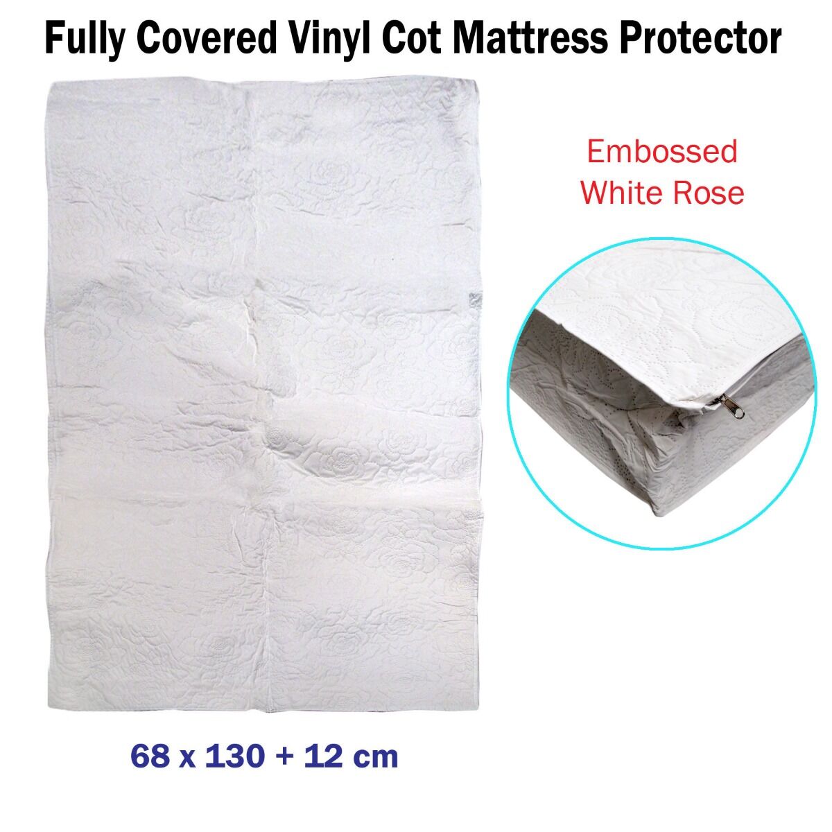 Shield your baby's crib mattress from leaks and spills with the Fully Covered Vinyl Cot Mattress Protector Embossed Rose White 68 x 130 + 12 cm. The embossed rose design adds a touch of elegance to your nursery, while the fully covered design ensures all sides of the mattress are shielded. This easy-to-clean protector is a must-have for any parent seeking to safeguard their baby's sleep space.