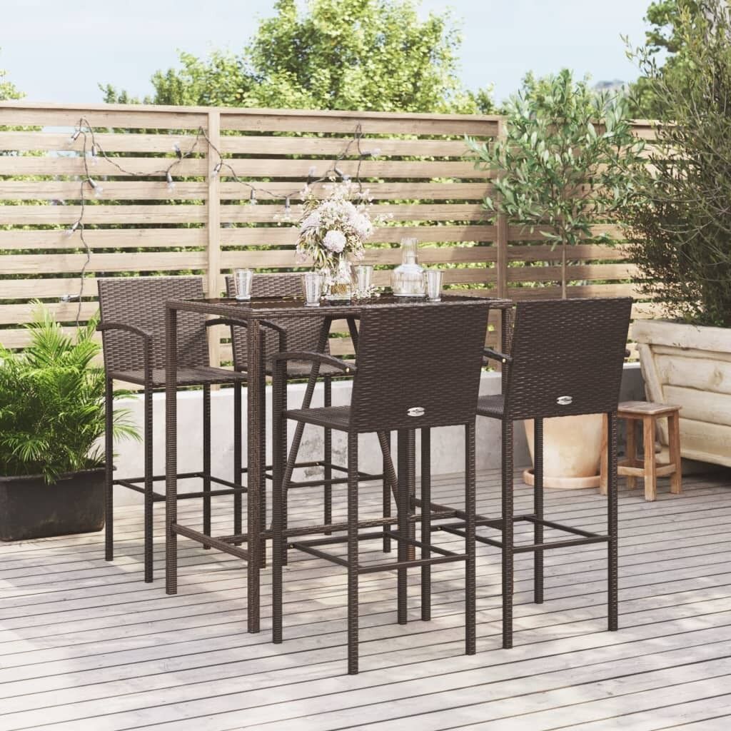 $487.85This trendy garden bar set, combining both style and function, is surely meant to be the centrepiece of your garden, patio, and any other living space. Weather-resistant material: PE rattan, also known as poly rattan, is weather resistant and easy to clean. It remains beautiful on the outside for a long period of time. It offers great quality, convenience and an aesthetic look.Comfortable seating: The bar stool is designed with armrests, a backrest, and a built-in footrest to offer you a comfortable seating experience.Tempered glass tabletop: The tabletop is made of tempered glass, making it easy to clean. Additionally, it offers excellent support for holding your drinks, snacks, and your favourite decorations.Sturdy and stable frame: The powder-coated steel frames make the pub set sturdy and stable for daily outdoor use.Wide applications: The bar table and stool, with its remarkable design, creates a pleasant overall appearance that integrates effortlessly into any environment. Good to know:To make assembly as easy as possible, each product is delivered with a manual.Note:To make sure your outdoor furniture stays beautiful, we recommend protecting it with a waterproof cover.