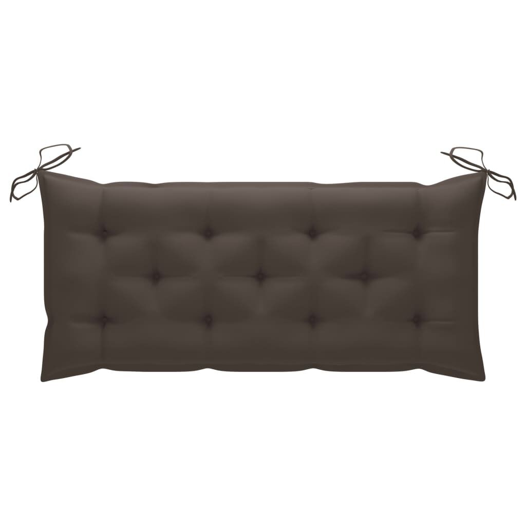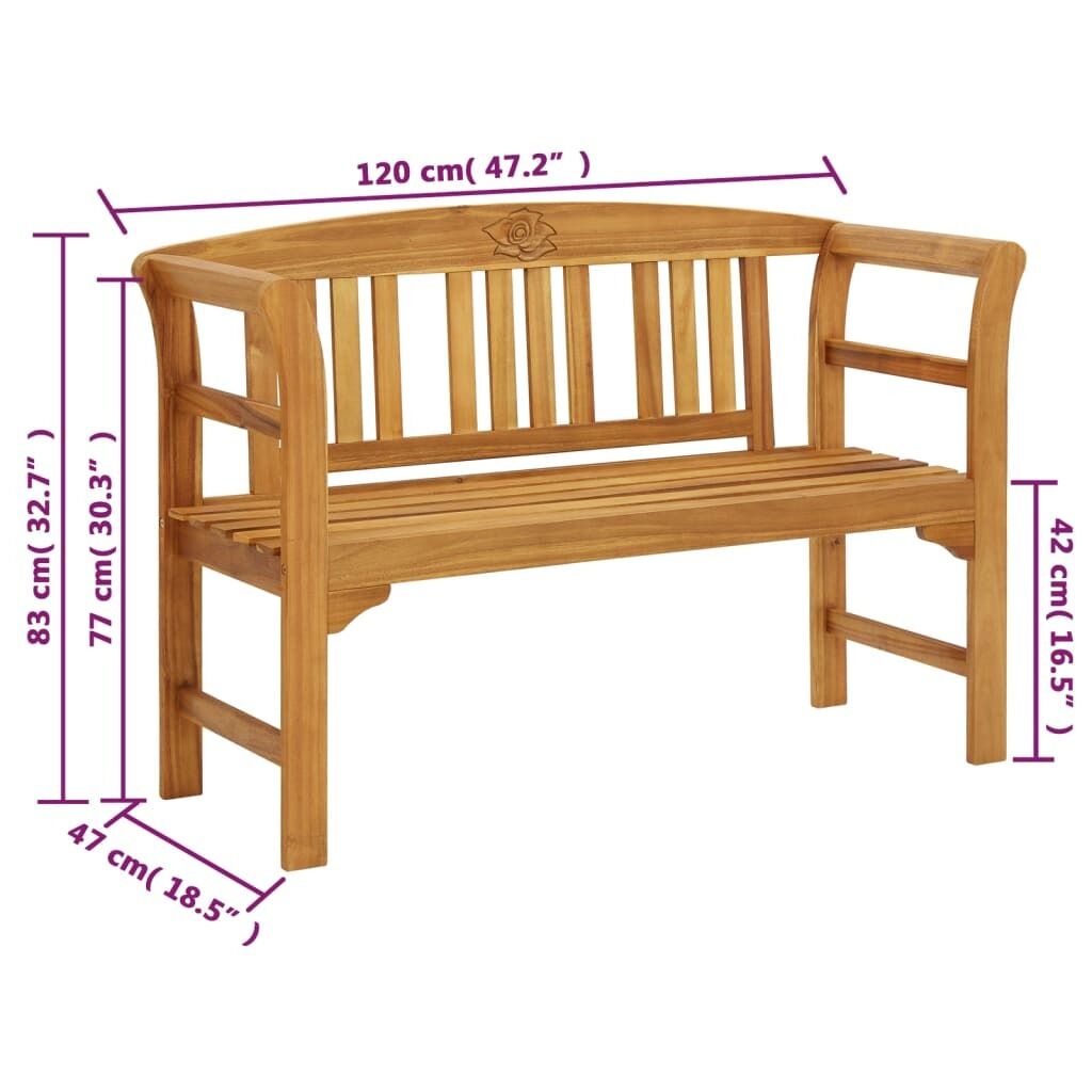 Decorate your yard with an inviting place to sit, relax and appreciate your surroundings! Featuring an engraved rose on the centre of the backrest, this wooden garden bench is an ideal accent for any lawn or garden. The outdoor bench is crafted from solid acacia wood with an oil finish, making it sturdy, durable and suitable for outdoor use. The backrest and the armrests add to the bench's seating comfort. The curved armrests give the bench an elegant look. What's more, the included cushion provides extra comfort while seating. It is made of 100% polyester that has been treated to make it waterproof. Each cushion has 2 sets of ropes to fix it on the bench tightly. Take a load off on this lovely garden bench!