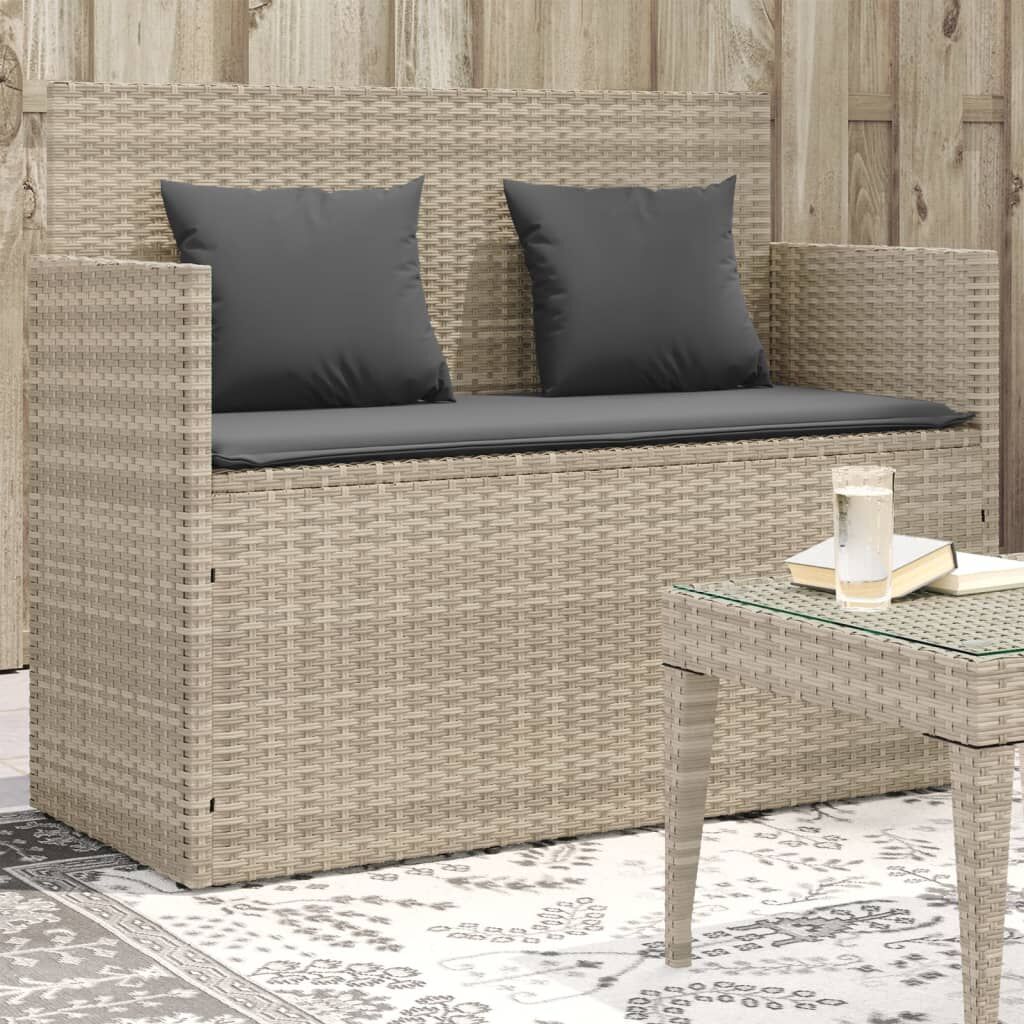 This garden bench not only offers outdoor seating but is also perfect for keeping your outdoor furniture cushions, gardening supplies, pool towels, and other items organised and easily accessible. Durable material: PE rattan, also known as poly rattan, is a strong, low-maintenance synthetic material that looks like natural rattan. It's lightweight, easy to clean, and commonly used for outdoor furniture due to its durability and weather-resistant properties.Storage function with water-resistant bag: The garden furniture features storage space under the seat, complete with a water-resistant bag for storing cushions, toys, and other items. The inner bag can be securely fastened to the outdoor furniture with hook-and-loop fasteners for added stability.Comfortable seat experience: This outdoor furniture, complete with a thickly padded cushion, offers a comfortable seating experience.Safe and easy to open and close: The gas spring makes it easy to open the lid and keep it from slamming shut or trapping fingers.Removable and washable cover: These seat cushions feature removable covers for easy washing and maintenance. Good to know:To make sure your outdoor furniture stays beautiful, we recommend protecting it with a waterproof cover.
