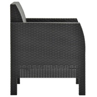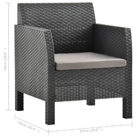 This garden chair set with cushions is designed to be the focal point of your garden, patio or terrace. The garden armchair is made of polypropylene, making it easy to clean and suitable for outdoor use. The included ergonomic backrest and rounded armrest provide additional seating comfort. Thanks to the lightweight construction, this garden chair is easy to move around to suit any setting. The cushion cover is UV resistant, removable and washable. Note: In order to extend the life of your outdoor furniture, we recommend you to clean it regularly and do not leave it outdoors without protection unnecessarily.Clean: Use a mild soap solutionStoring: If possible, store in a cool, dry place indoors. If the product is stored outdoors, protect it with a waterproof cover. Wipe and dry the excess water or snow from flat surfaces after a rain or snowfall. Allow sufficient air circulation to avoid moisture-related damage.