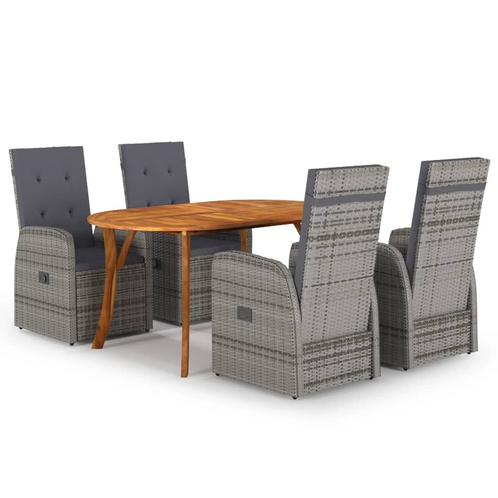 $922.13Create a compelling and cohesive aesthetic in your outdoor space with this garden dining set! This outdoor table is made of solid acacia wood, making it sturdy and stable. The oil-finished surface also makes the table easy to clean with a damp cloth. Additionally, the curved legs contribute to its stylish design. Featuring a steel frame covered with weather-resistant PE rattan, these dining chairs are sturdy and easy to clean. The thickly padded cushions add comfort in your lounging time. Note: In order to extend the life of your outdoor furniture, we recommend you to clean it regularly and do not leave it outdoors without protection unnecessarily.Clean: Use a mild soap solutionStoring: If possible, store in a cool, dry place indoors. If the product is stored outdoors, protect it with a waterproof cover. Wipe and dry the excess water or snow from flat surfaces after a rain or snowfall. Allow sufficient air circulation to avoid moisture-related damage.