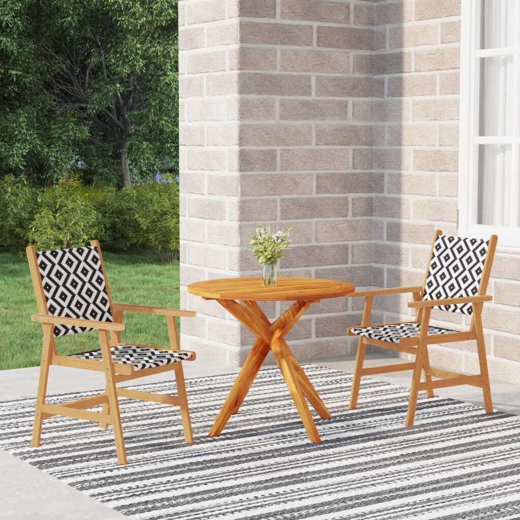$280.11This garden dining set provides a perfect place for you to relax and enjoy the sunshine in your garden or patio. Premium material: Solid acacia wood is a beautiful natural material. It is a tropical hardwood, which is dense, sturdy, and durable.Sturdy tabletop: The sturdy tabletop offers you ample space to put snacks, fruit baskets, decorative items, and other essentials.Lattice pattern: Thanks to the attractive lattice pattern, the patio chairs are an eye-catcher in any living space.Note:In order to extend the life of your outdoor furniture, we recommend you to clean it regularly and do not leave it outdoors without protection unnecessarily.Clean: Use a mild soap solution.Storing: If possible, store in a cool, dry place indoors. If the product is stored outdoors, protect it with a waterproof cover. Wipe and dry the excess water or snow from flat surfaces after a rain or snowfall. Allow sufficient air circulation to avoid moisture-related damage.