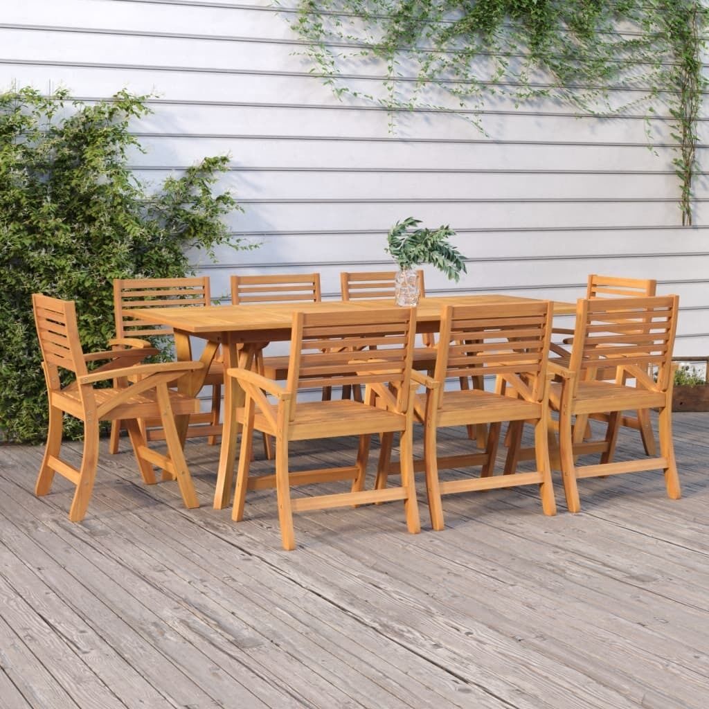 $517.93Relax and enjoy a lovely afternoon tea and meals with your family and friends with this classic wooden garden dining set! Solid acacia wood: The dining set is made of solid acacia wood. Solid acacia wood is a beautiful natural material. Acacia wood is a tropical hardwood, which is dense, sturdy, and durable.Comfortable experience: The curved back and armrests of the dining chair ensure optimum comfort and relaxation.Sturdy tabletop: The dining table features a tabletop with a slatted design, making it an excellent spot for dining and placing decorative items such as vases and potted plants.Elegant design: The curved legs of the garden dining table and garden dining chairs add to their elegant design.Easy-to-clean surface: The oil-finished surface makes the patio dining set easy to clean with a damp cloth. Note:To make sure your outdoor furniture stays beautiful, we recommend protecting it with a waterproof cover.