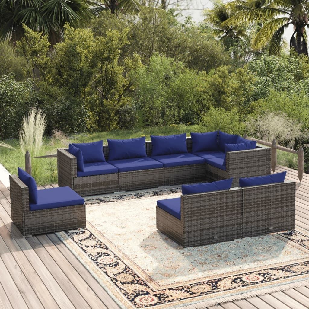 $899.57Relax and enjoy your leisure time with this trendy poly rattan garden lounge set! It is meant to be an excellent choice for you to take a breather from your hectic life. Sturdy and lightweight frame: This patio lounge set features a sturdy powder coating steel frame and plastic chrome feet, which is highly durable. Thanks to its lightweight construction, the sofa set is easy to move.Water-resistant material: Made of water-resistant material, the garden sofa set can withstand humidity and rainy weather. It can also be easily cleaned with a damp cloth when needed.Modular design: The modular design makes it possible to place the set in any arrangement or combine them with other modular segments to meet your needs.Comfortable cushions: The thickly padded and removable cushions provide optimal comfort for your outdoor sitting. Note:In order to extend the life of your outdoor furniture, we recommend you to clean it regularly and do not leave it outdoors without protection unnecessarily.Clean: Use a mild soap solution.Storing: If possible, store in a cool, dry place indoors. If the product is stored outdoors, protect it with a waterproof cover. Wipe and dry the excess water or snow from flat surfaces after a rain or snowfall. Allow sufficient air circulation to avoid moisture-related damage.