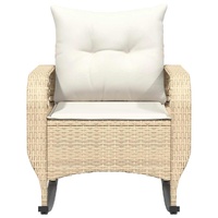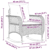 Relax and enjoy the outdoors in this comfortable garden rocking chair! Durable material: PE rattan, also known as poly rattan, is a strong, low-maintenance synthetic material that looks like natural rattan. It's lightweight, easy to clean, and commonly used for outdoor furniture due to its durability and weather-resistant properties.Soothing rocking & stability: Gently rock back and forth on this garden seat for ultimate relaxation. The bottom of the outdoor rocking chair's metal legs is fitted with rubber tape to increase grip and stability, preventing it from tipping over during use.Comfortable seat experience: This outdoor furniture, complete with thickly padded cushions, offers a comfortable seating experience.Removable and washable cover: The seat cushion features a removable cover for easy washing and maintenance.Robust and stable frame: The powder-coated steel frame ensures that the garden furniture is strong and stable for daily outdoor use. Good to know:To make sure your outdoor furniture stays beautiful, we recommend protecting it with a waterproof cover.