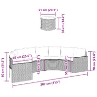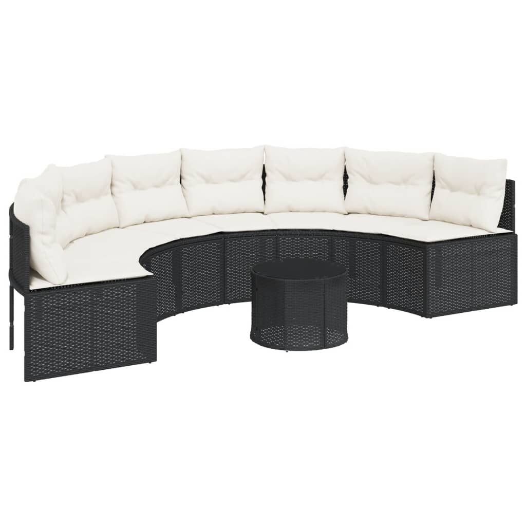This half-round-shaped garden sofa is the perfect addition to your garden, terrace, or patio, providing a comfortable and inviting space for chatting with family and friends or simply relaxing and enjoying the outdoors. Durable material: PE rattan, also known as poly rattan, is a strong, low-maintenance synthetic material that looks like natural rattan. It's lightweight, easy to clean, and commonly used for outdoor furniture due to its durability and weather-resistant properties.Comfortable seat experience: This outdoor furniture, complete with thickly padded cushions, offers a comfortable seating experience.Removable and washable cover: These seat cushions feature removable covers for easy washing and maintenance.Glass tabletop: The outdoor table's top is made from strong and durable tempered glass, making it easy to clean with a damp cloth and adding a touch of elegance to your outdoor space.Robust and stable frame: The powder-coated steel frame ensures that the garden furniture is strong and stable for daily outdoor use. Good to know:To make sure your outdoor furniture stays beautiful, we recommend protecting it with a waterproof cover.