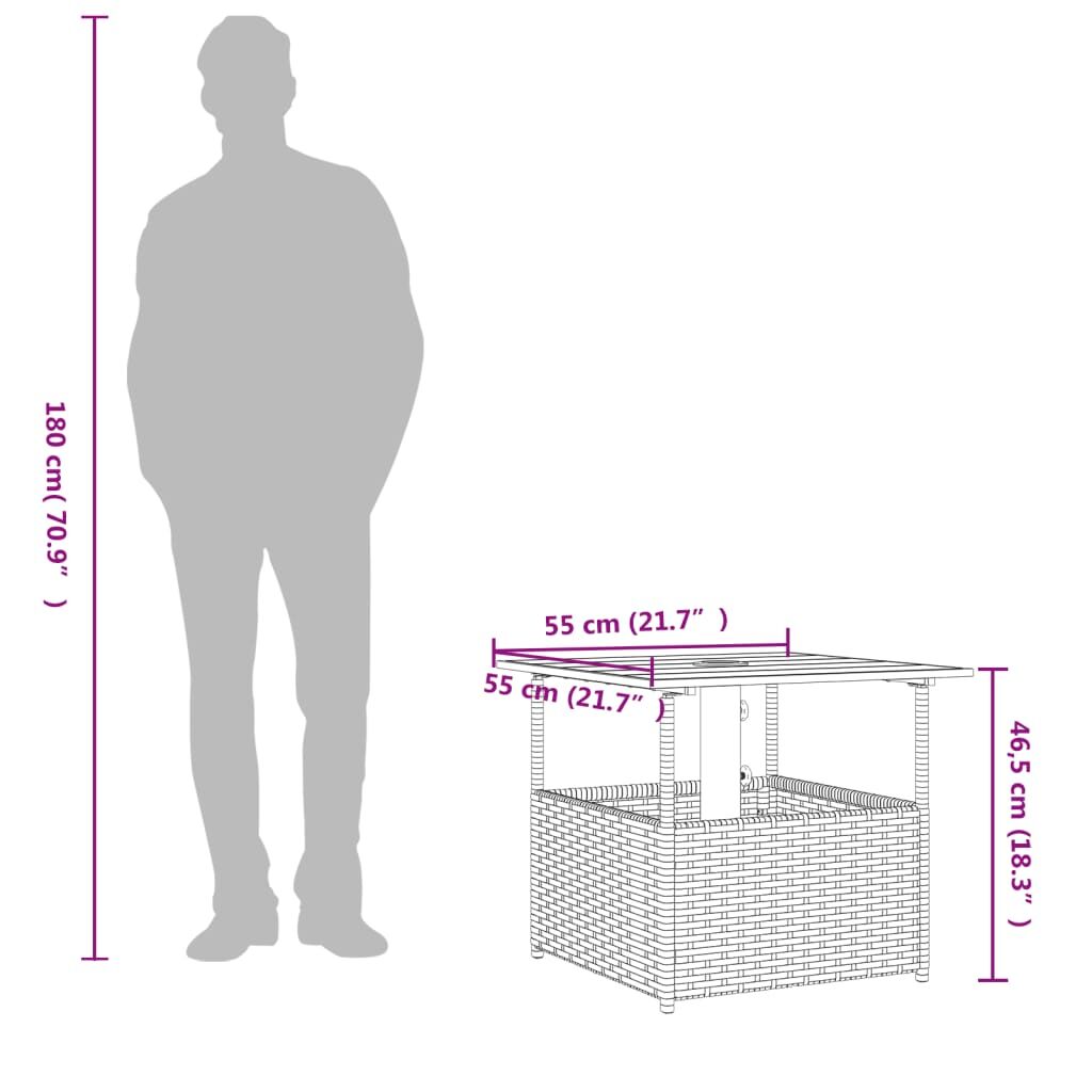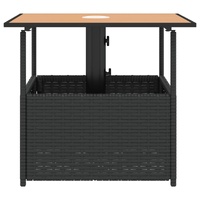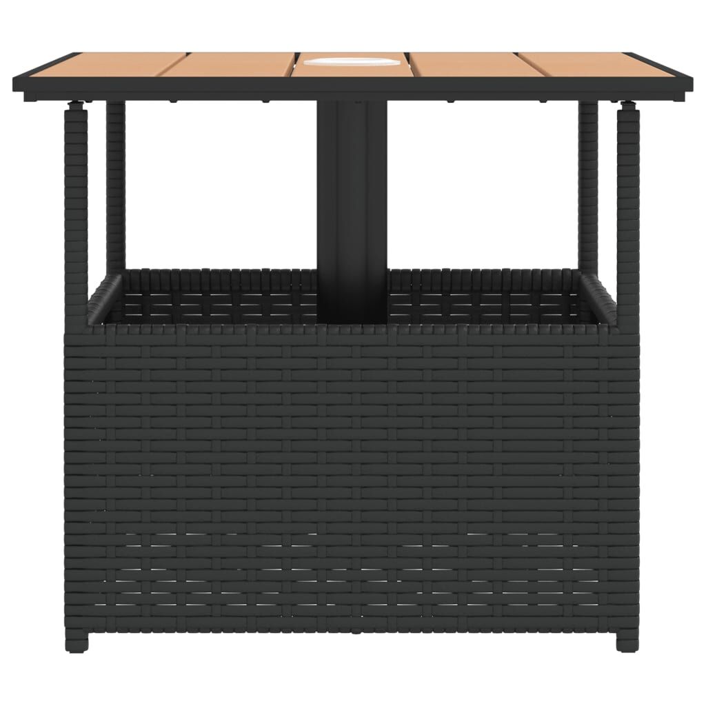 This garden table with a parasol hole is the perfect addition to your backyard, terrace, or patio, providing a comfortable and inviting space for chatting with family and friends or simply relaxing and enjoying the outdoors. Durable material: PE rattan, also known as poly rattan, is a strong, low-maintenance synthetic material that looks like natural rattan. It's lightweight, easy to clean, and commonly used for outdoor furniture due to its durability and weather-resistant properties.Stable and easy-to-clean tabletop: This garden table has an acacia wood top that is sturdy, durable, and easy to clean with a damp cloth.Robust and stable frame: The powder-coated steel frame ensures that the garden furniture is strong and stable for daily outdoor use. Good to know:To make sure your outdoor furniture stays beautiful, we recommend protecting it with a waterproof cover.