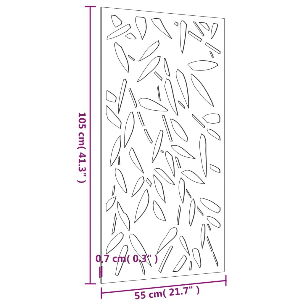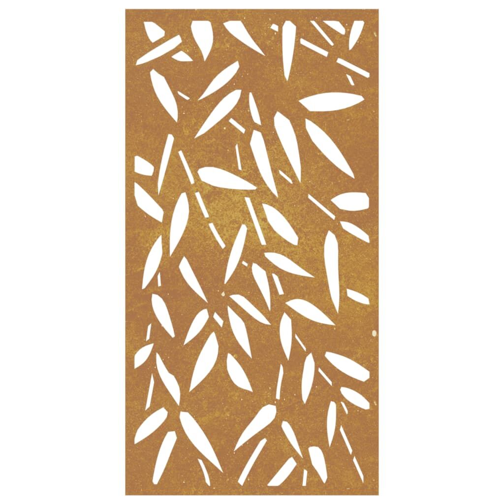 Turn a blank wall or fence into a masterpiece with this garden wall decoration. Durable material: Corten steel, also known as weathering steel. This is anti-corrosive by its very nature. It develops a rusty protective layer against corrosion when first exposed to atmospheric conditions. Thus, you don't need to paint it. This can help you save on maintenance and repair costs. The distinctive brown colour on the corten steel will surely be an eye-catcher. Finally, weathering steel is exceptionally durable and will stand up to the test of time.Exquisite design: The metal wall decoration adopts a hollow design of bamboo leaves pattern, creating a natural atmosphere in your garden.Easy installation: The outdoor wall decoration is easy to install with the mounting holes on the back. Good to know:This product is not rusted yet and has a normal metal colour when you receive it, but rust will develop over time. You could speed up the rusting process by spraying it with soap water and salt water. To keep your clothes stain-free, avoid contact with the developing rust layer.