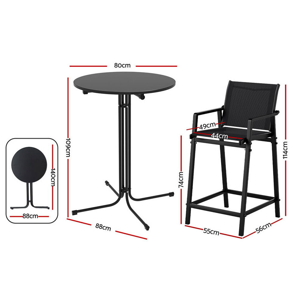 Upgrade your outdoor space with Gardeon's durable 3-piece bar set, perfect for stylish patio settings. The weather-resistant table features a sturdy steel frame and easy-clean MDF top, supporting up to 50kg with non-slip stability. Matching bar stools complete your outdoor setting with powder-coated steel frames, high backrests and built-in footrests for comfort. Designed for quick assembly and all-weather use. Ideal for balconies, gardens or poolside entertaining, this complete outdoor furniture set combines lasting durability with contemporary design. Create your perfect alfresco dining experience with Gardeon.