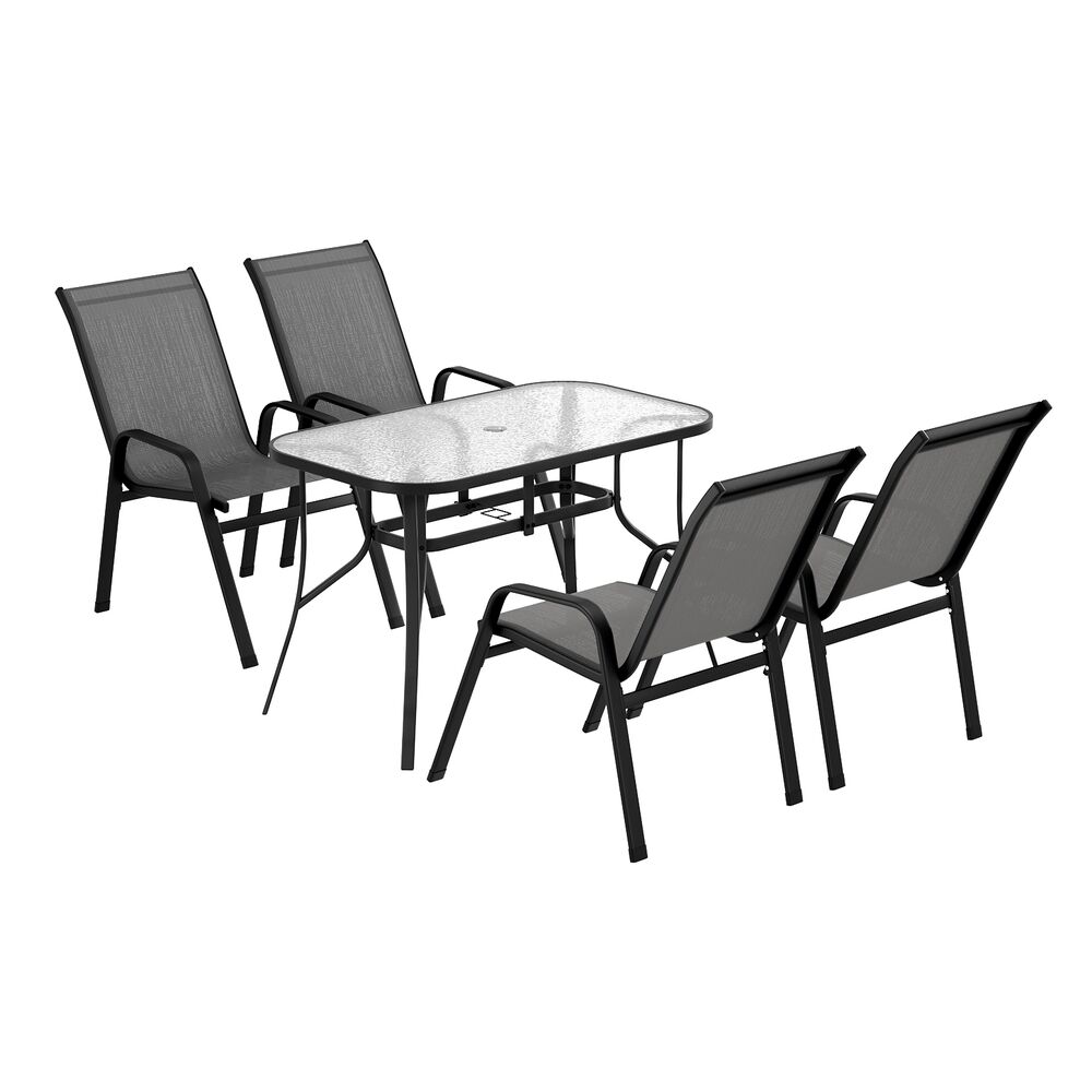 Elevate your outdoor living with the Gardeon 5 Piece Mesh Dining Set—perfect for sunny gatherings in fresh air! The rust-proof powder-coated steel frame ensures lasting durability, while the all-weather synthetic fabric resists sun, rain, and stains, keeping colors vibrant for years. The spacious tempered glass table features a convenient parasol hole for shade, and the stackable chairs maximize storage space. Floor protectors safeguard your surfaces while providing stability on uneven ground. With its sleek, versatile design, this set transitions seamlessly from patio to indoor dining. Low-maintenance and built for comfort, the Gardeon dining set is ideal for relaxing meals with family and friends under the open sky!
