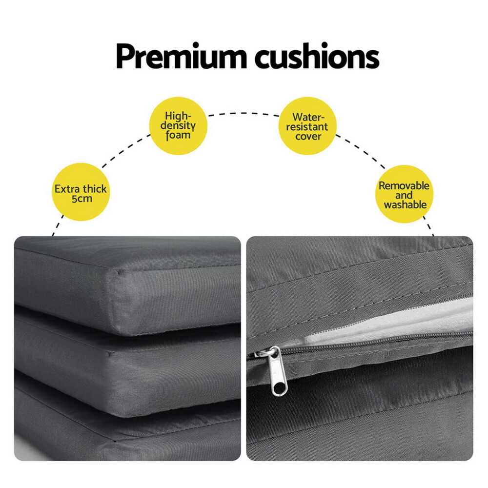 NOW $557.96With summer fast approaching, you can once again join the sunshine with the Gardeon 5-piece Outdoor Dining Set. Made from a powder-coated metal frame, the set is designed for outdoor or indoor use in a wide range of weather conditions. The table and chairs are designed to comfortably seat four people across four single chairs, or the table can be extended to fit up to six (extra chairs not included). The stable structure features fixed safety screws, giving each chair a 150kg weight capacity and a table weight capacity of 50kg. The seats are classically designed and completely comfortable with an inclined backrest, comfortable handrails, and 5cm thick foam cushions. The cushions feature removable and washable covers for easy cleaning. The table and chairs feature a slatted surface for easy drainage during wet weather. With easy and hassle-free assembly, the Gardeon 5-piece Outdoor Dining Set is the perfect addition to any backyard, patio or even sitting room.