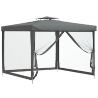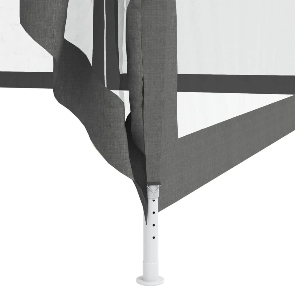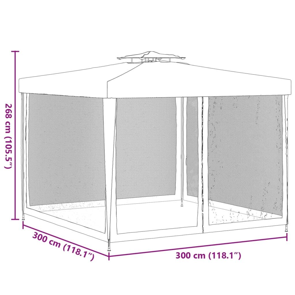 This gazebo, featuring a water-resistant double roof and four mesh sidewalls, is an ideal shelter from the sun. Durable material: Polyester is a synthetic material known for its UV resistance and its tensile strength. Polyester is water-resistant, which makes it the perfect choice for humid or rainy conditions, and is also easy to clean.Sturdy construction: The steel frame of this pavilion ensures sturdiness and stability.Great protection: The marquee with 1 double roof and 4 mesh sidewalls provides great protection from the sun, rain, and wind, making it a great option for outdoor events.Practical design: One of the side walls has a zipper for entrance and easy access. Also, this event tent is easy to set up and take down.Versatile design: This shelter tent can be used for a wide range of purposes, from outdoor dining and entertaining to relaxation and meditation.