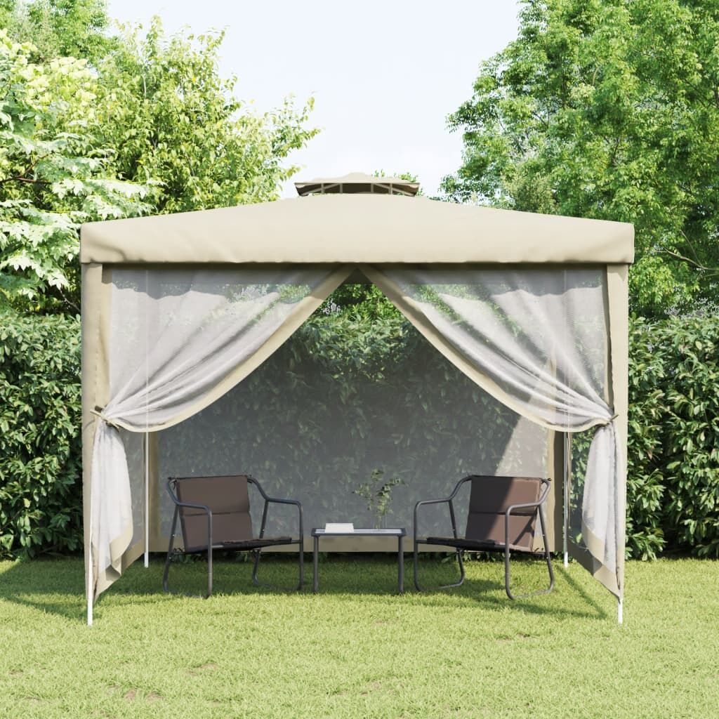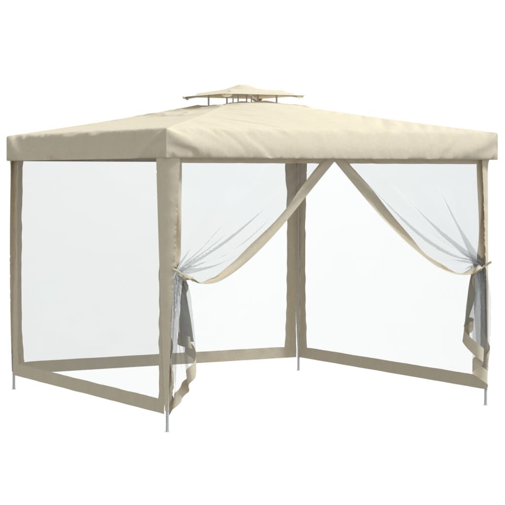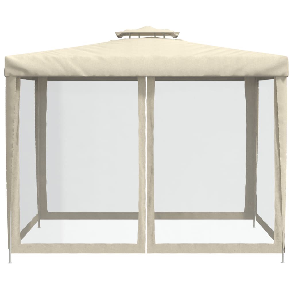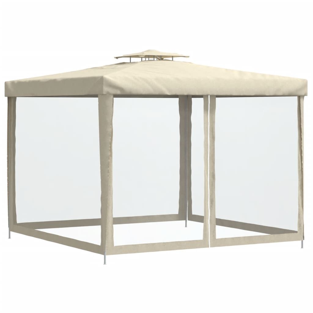 This gazebo, featuring a water-resistant double roof and four mesh sidewalls, is an ideal shelter from the sun. Durable material: Polyester is a synthetic material known for its UV resistance and its tensile strength. Polyester is water-resistant, which makes it the perfect choice for humid or rainy conditions, and is also easy to clean.Sturdy construction: The steel frame of this pavilion ensures sturdiness and stability.Great protection: The marquee with 1 double roof and 4 mesh sidewalls provides great protection from the sun, rain, and wind, making it a great option for outdoor events.Practical design: One of the side walls has a zipper for entrance and easy access. Also, this event tent is easy to set up and take down.Versatile design: This shelter tent can be used for a wide range of purposes, from outdoor dining and entertaining to relaxation and meditation.