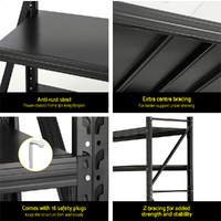 $206.09Looking for a heavy-duty shelving unit that does the work confidently and still looks modern and sturdy? Look no further than the Giantz Warehouse Shelving Unit which can hold up to a massive 200kg per shelf. Thats the equivalent weight of an average gorilla sitting on one shelf! Besides the gigantic weight capacity, Giantz shelving units are built with industrial-strength steel with added Z-bracing to hold and keep the structure firm and steady when fully loaded. The anti-rust coating keeps the shelves sturdy and long-lasting. The unit is easy to assemble simply use a rubber mallet to tap the frame into place. The shelves are easily height adjustable so you can create your ideal set-up. Comes with 16 safety plugs to keep the frame stable and steady.