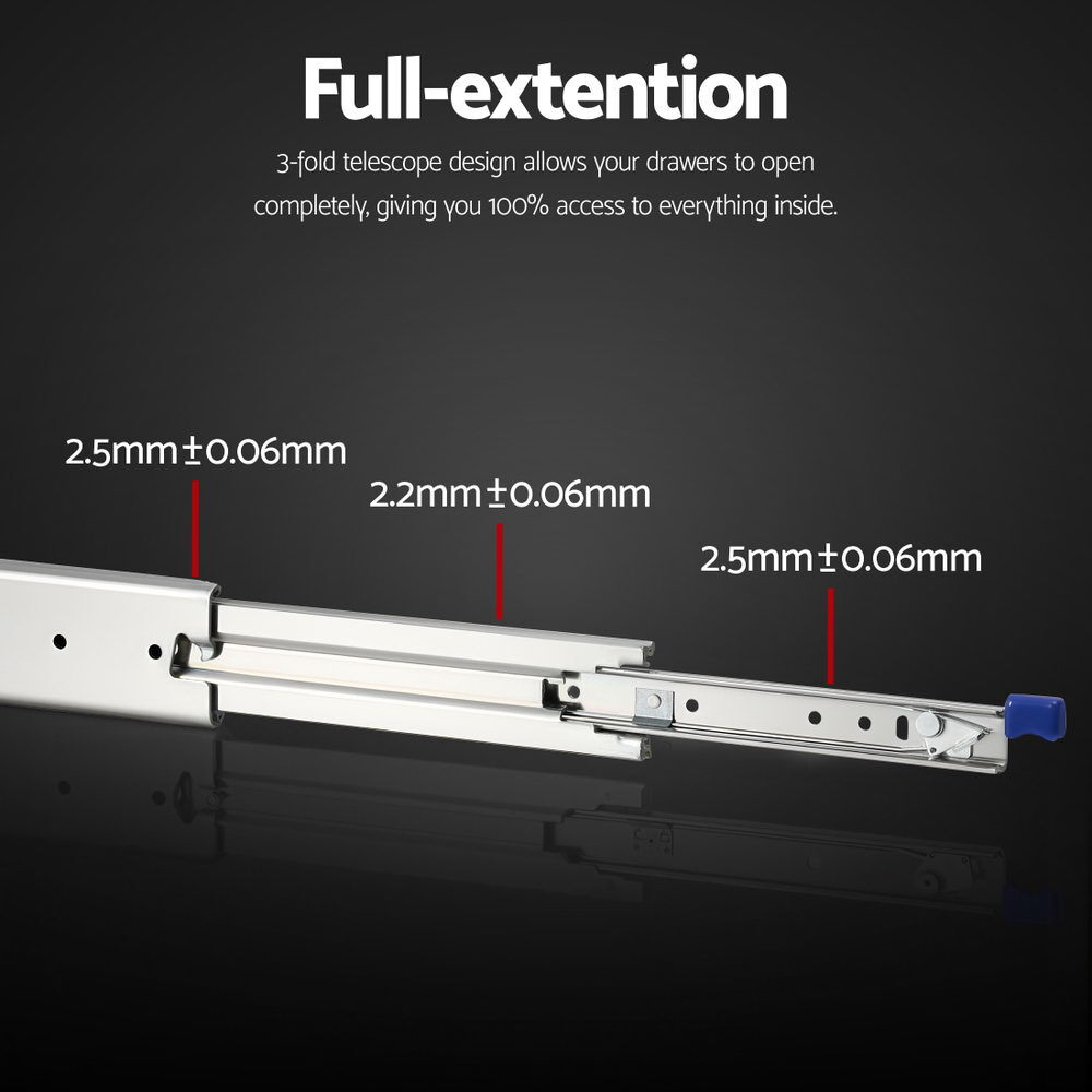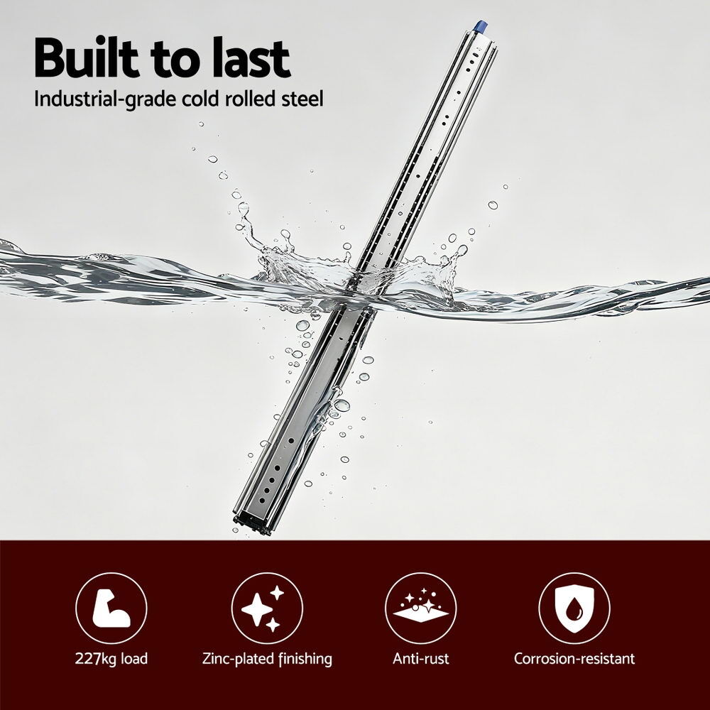 The Giantz Heavy Duty Drawer Slides come as a pair, measuring 76mm in width and 19.5mm in thickness, with a full extension range from 1524mm to 3048mm. The three-section ball bearing design ensures smooth and quiet sliding.The secure lock-in and lock-out mechanism keeps drawers safely fixed in the fully closed or fully extended position, preventing accidental overextension or detachment from the tracks. Crafted from robust cold rolled steel with a corrosion-resistant zinc plated finish, these slides support up to 227kg load capacity, providing reliable strength for heavy storage.Ideal for large drawers, cabinets, industrial storage, vehicle fit-outs, and multimedia equipment, these slides are versatile and built to last. Each set includes two slides, 12 x M5 screws, and 12 x M5 screw nuts as a bonus for easy installation.