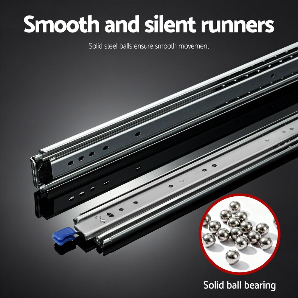 The Giantz Heavy Duty Drawer Slides come as a pair, measuring 76mm in width and 19.5mm in thickness, with a full extension range from 914mm to 1829mm. The three-section ball bearing design ensures smooth and quiet sliding.The secure lock-in and lock-out mechanism keeps drawers safely fixed in the fully closed or fully extended position, preventing accidental overextension or detachment from the tracks. Crafted from robust cold rolled steel with a corrosion-resistant zinc plated finish, these slides support up to 227kg load capacity, providing reliable strength for heavy storage.Ideal for large drawers, cabinets, industrial storage, vehicle fit-outs, and multimedia equipment, these slides are versatile and built to last. Each set includes two slides, 12 x M5 screws, and 12 x M5 screw nuts as a bonus for easy installation.