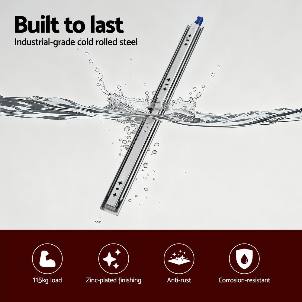 Enhance your storage setup with the Giantz Heavy-Duty Drawer Slides, engineered for superior performance and durability. Available in a range of lengths from 750mm to 1500mm, these slides can handle a substantial load of up to 115kg, making them perfect for your toughest projects. Whether it's a UTE toolbox, a camper trailer's storage, or a 4WD cargo system, or household cabinets, these slides provide reliable support. Experience effortless operation with the precision ball bearings, ensuring a smooth and silent glide every time. The integrated nylon buffer design offers a soft and quiet close, while the optimized PP triggers make locking and unlocking simple and safe. Built from thickened zinc-coated cold-rolled steel, these slides are designed for a long lifespan, capable of withstanding over 50,000 opening and closing cycles. The lock-in/lock-out design ensures your drawers stay securely in place on uneven ground. With full extension, you can easily access items at the very back of your drawer, maximising your storage and convenience. Upgrade your drawers with Giantz and enjoy a combination of strength, safety, and smooth functionality.