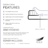 The Gioia Casa Ultra-Soft Cotton Quilted Mattress Cover Protector is designed not only to protect your mattress but also to enhance your sleep experience. Its soft cotton fabric, combined with the elegant quilted design, offers luxurious comfort, while the anti-microbial and hypoallergenic properties ensure a clean and healthy sleep environment. The waterproof backing provides peace of mind by safeguarding your mattress from any spills or stains. Invest in this high-quality mattress protector today and enjoy the perfect blend of comfort, protection, and style every night.