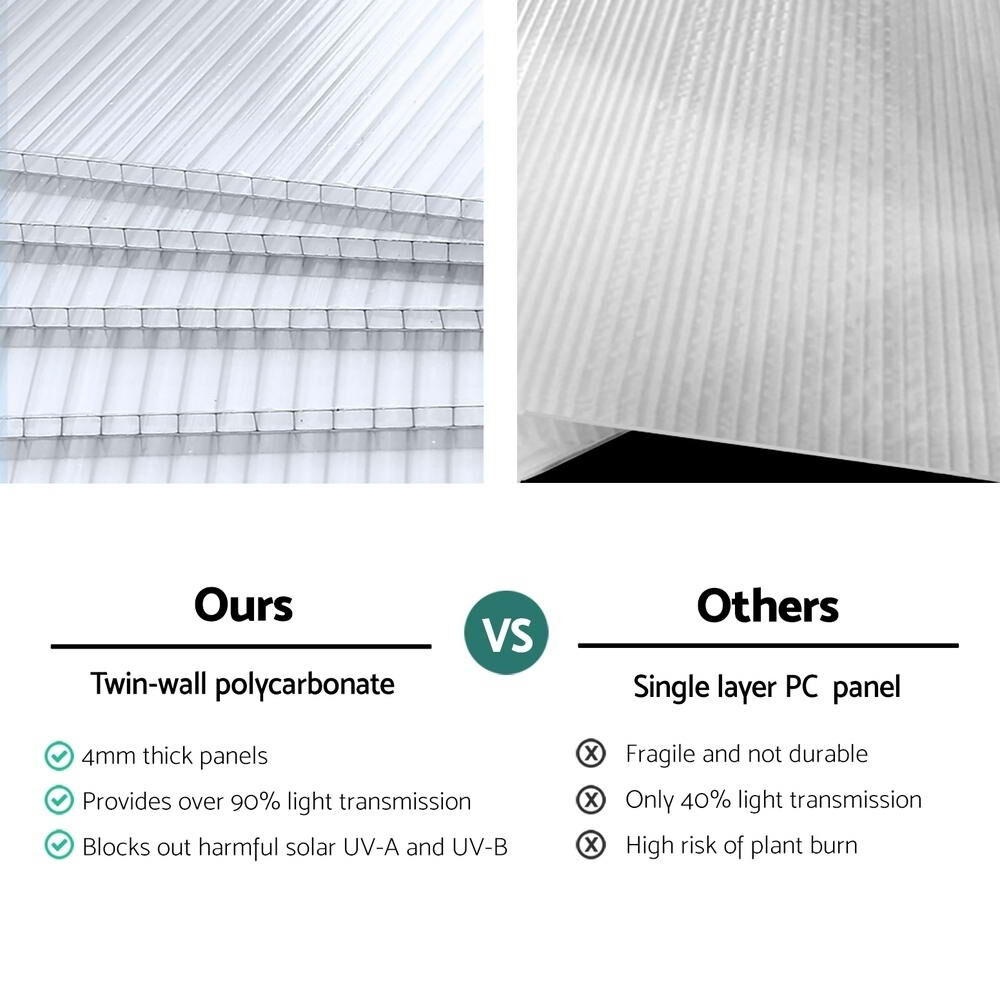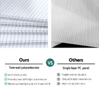 This spacious greenhouse features twin-wall UV-resistant polycarbonate panels that allow up to 90% light transmission, minimizing plant burn. Its triangular aluminium framework ensures durability, while two adjustable roof vents provide optimal airflow and moisture control. An efficient gutter system facilitates smooth drainage.