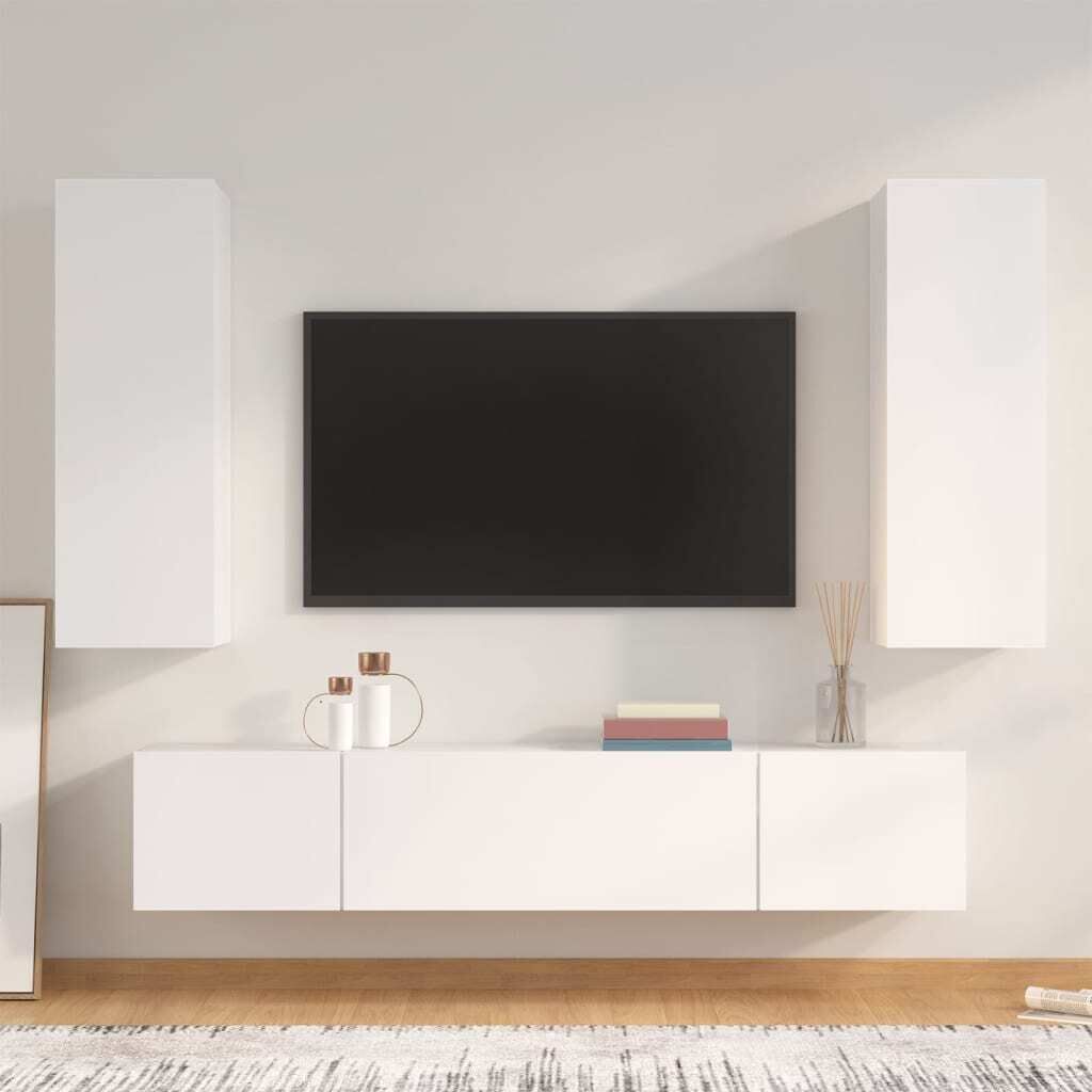 $197.39This classic TV cabinet set is designed to be a focal point of your room, featuring a trendy yet practical design. Sturdy material: The engineered wood is of exceptional quality with smooth surface and also features strength, stability and resistance to moisture.Ample storage: Each TV stand provides ample storage space to keep all your magazines, DVDs and any other items well organised.Wall-mounted design: The TV unit doesn't take any floor space. You can hang it on the wall easily. Note:Screw(s) and plug(s) for inside the wall are not included. Seek and use screw(s) and plug(s) suitable for your walls. If you are uncertain, seek professional advice. Read and follow each step of the instruction carefully.Each product comes with an assembly manual in the box for easy assembly.
