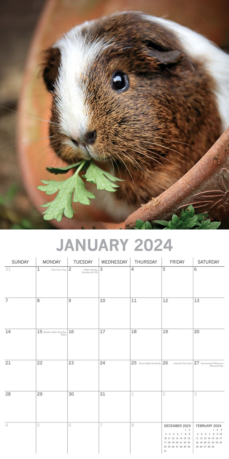 Whisker into 2024 with the adorable antics of guinea pigs. Perfect for pet enthusiasts, this calendar offers full-color images and a spacious grid to chronicle your own furry tales. Brand New Calendar with Beautifully design, Sealed in Original Packaging, each calendar includes a large grid running from Sunday to Saturday. Publisher: The Gifted Stationery Co. Dimensions: 30cm (w) x 30cm (h) closed; 30cm (w) x 60cm (h) opened Time Span: 16 months (January to December 2024 monthly, September to December 2023 on-a-page) 2024 Square Wall Calendar featuring beautiful colour photographed images for every month of the year. Like most Wall calendars, this one comes with: