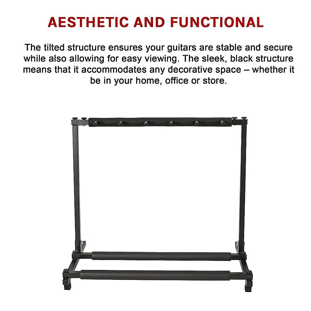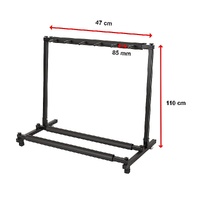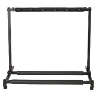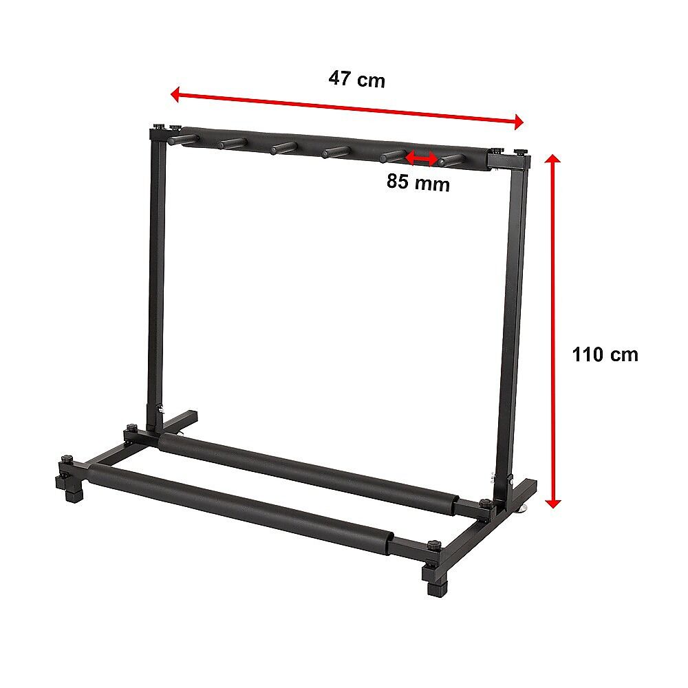 The stand itself offers optimal sturdiness and can support the load of up to 5 guitars. Whether you have a mixture of acoustic guitars, bass guitars or electric guitars, the stand is built to support all types. The black neoprene rubber base prevents slippage or scuffing, so you can guarantee your much-loved instruments maintain their condition. The guitars are separated by pegs to avoid them leaning against one another and keep them in standing formation. Accompanied by a durable iron structure, you can rest assured that this guitar-holding stand will withstand the test of time. We understand that, as a musician, you may constantly be hitting the road. That's why the stand is easy to fold into a compact position, ready for transportation.