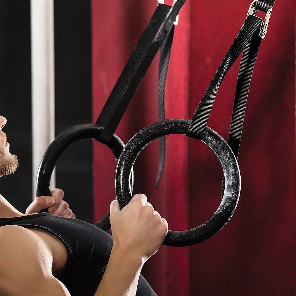 Two gym hoops come with adjustable nylon straps which can be hung around building features, etc. Exercising with gym hoops will result in gains in upper body strength that you won't believe. You'll increase your overall core strength and even improve your posture. It's also a more fluid movement that will reduce wear and strain on your joints.