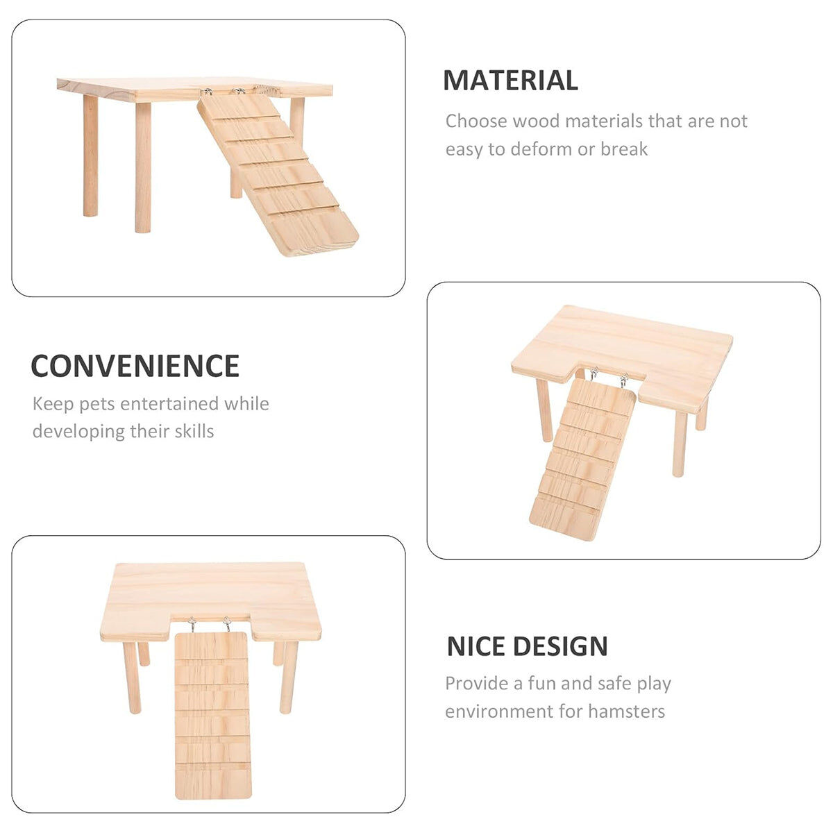 Create a playful and secure habitat with this wooden hamster platform featuring stairs and an elevated second floor. Made from natural pine wood, this pet structure is safe, chew-resistant, and provides enrichment through climbing, exploring, and resting. Designed in both L-shaped (left stair) and U-shaped configurations, it includes a hook-on ramp for convenience and can be easily installed in most cages. Perfect for Syrian hamsters, golden bears, rutin hamsters, and other small pets, this multifunctional playhouse adds an attractive landscape element while supporting physical and mental stimulation.
