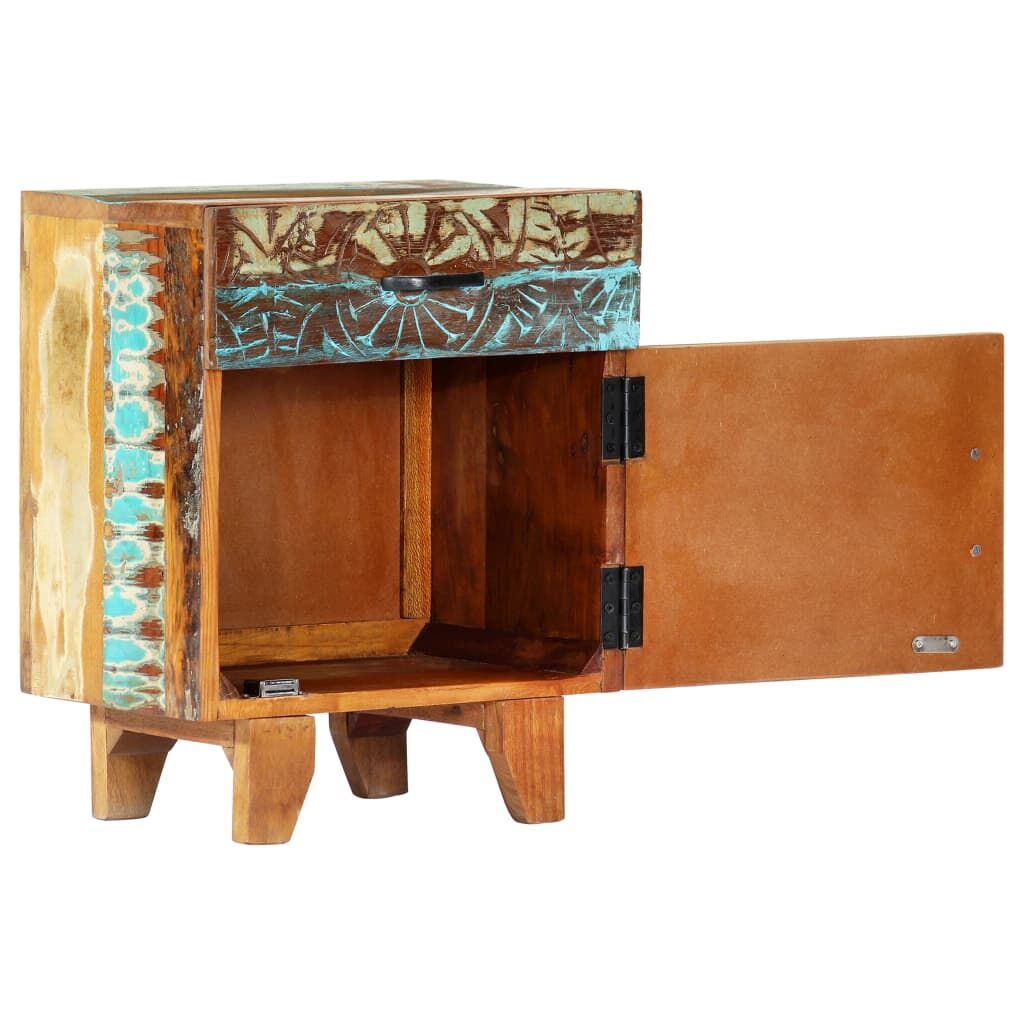 Bring the luxury of mid-century inspired design to your interior with our stylish solid wooden bedside cabinet! This colourful nightstand with antique hand carved pattern is made of solid reclaimed wood that has been sourced from joists, floors and support beams from old buildings being demolished, and it can consist of different types of wood like pine, teak, beech, oak, cedar, mango wood, acacia, etc. This means the reclaimed wood retains the characteristics of these different types of wood. Reclaimed wood is already aged, weathered and dried, so it doesn't shrink or bend. Every step of the process is carried out with the greatest care, be it painting, polishing or lacquering. The exquisite craftsmanship and the graceful wood grains make every piece of furniture distinctive and slightly different from the next. Additionally, this vintage bed drawer cabinet is distinguished by 1 drawer and 1 door, offering an ideal solution for keeping your smaller items organised and within reach. The storage cabinet is easy to assemble. Important note: Colours and wood grains vary from piece to piece, making each of our bed cabinet unique. The delivery is random, ensuring the exclusivity and individuality of your product.