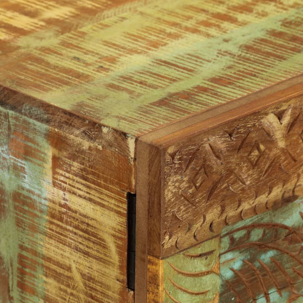 This wooden sideboard has a distinctive design and will add a touch of retro style to your interior. Solid reclaimed wood: Solid reclaimed wood consists of reused timbers such as teak, mango wood, pinewood, and beech. These materials are recycled from old buildings such as factories, sheds, and boats. As every piece is handmade, colours will vary for each product.Practical design: The sideboard cabinet has compartments which provide ample storage space for keeping books, or glassware, etc. organised, while the sturdy top is ideal for displaying decorative items, like vases, photo albums, fruit baskets, etc.Retro style: This colourful side cabinet with antique hand carved pattern brings the luxury of mid-century inspired design to your interior, being the focal point of your room. Note: The colours may vary from piece to piece, making each piece unique and slightly different from the next. The delivery is random, ensuring the exclusivity and individuality of your product.Warning:To prevent it being overturned, this product must be used with the provided wall attachment device.