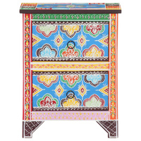 This hand painted bedside cabinet adds a pop of colour and makes an eye-catching addition to your current home interior. This nightstand is made of solid mango wood, a tropical hardwood. It has the strength to bear the weight and also stand the wear and tear of time. Additionally, the exquisite craftsmanship and beautiful wood grains make every piece slightly different from the next. The wooden side cabinet has a sturdy top, on which you can place a bedside lamp, alarm clock or anything else you might need near your bed. The 2 drawers provide ample space for keeping all kinds of smaller items organised and within reach. The rich, hand-painted decorative details make it a beautiful decoration for your interior. Important note: The colours vary from piece to piece, making each piece unique. The delivery is random, ensuring the exclusivity and individuality of your product.