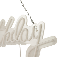 The sign is mounted on two pieces of transparent acrylic board that are connected by decorative chains. Wall mountings are included, or the sign can be hung from a ceiling or other vertical support.