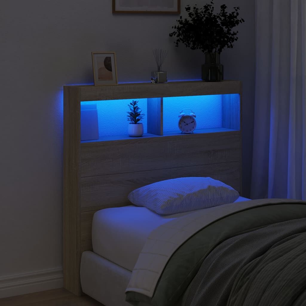 This headboard cabinet with LED, featuring a stylish design, gives your bed frame a stunning modern touch and is perfectly suitable in any bedroom. Durable material: The engineered wood is of exceptional quality with smooth surface and also features strength, stability and resistance to moisture.RGB LED lights: The bed headboard is equipped with vibrant RGB LED lights. With various customisable menus, you can effortlessly change the colour of the lights and even set them to adjust automatically. These LED lights not only enhance the contemporary look of the bed header but also add to its trendy appeal.Ample storage space: Featuring compartments and a sturdy top, the bed headboard cabinet is perfect for displaying your books, decorative items, picture frames and alarm clocks.Excellent support: The headboard for bed provides you with excellent back support when you sit up in bed to read or watch TV. Good to know:The delivery includes LED headboard only. The bed frame and mattress are not included. You can check our shop for the matching frames and mattresses.The product has a USB connector that requires a certified 5V USB power source (not included). Warning:To prevent it from tipping over, this product must be used with the provided wall attachment device.