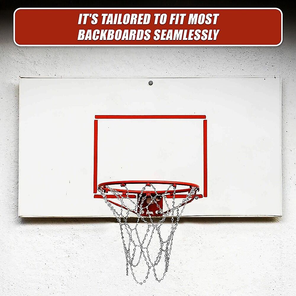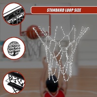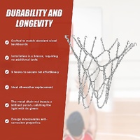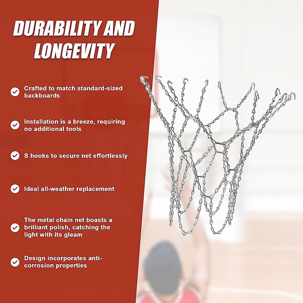 The metal chain net boasts a brilliant polish, catching the light with its gleam. Its design incorporates anti-corrosion properties, ensuring lasting performance even in challenging weather conditions. With a standard loop size, it's tailored to fit most backboards seamlessly. Upgrade your basketball experience with a net that combines durability, ease of use, and a touch of shine.