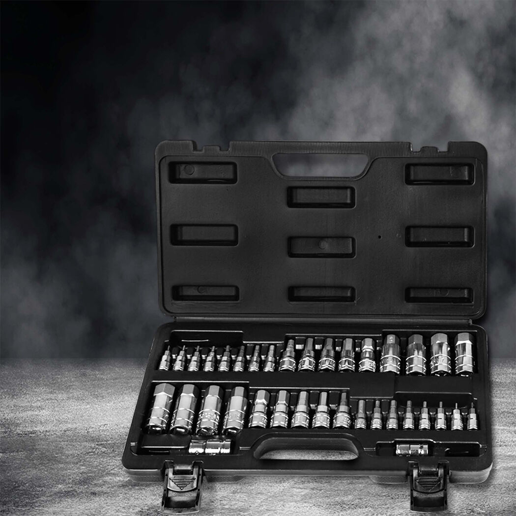 You have 36 pieces to play with. Work from the metric or imperial label. Use the adaptors in your socket wrench. Securely connect and start screwing or unscrewing all your bolts.