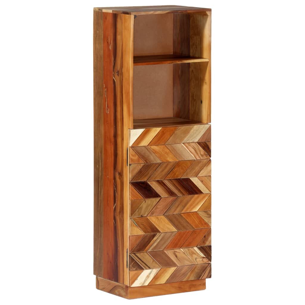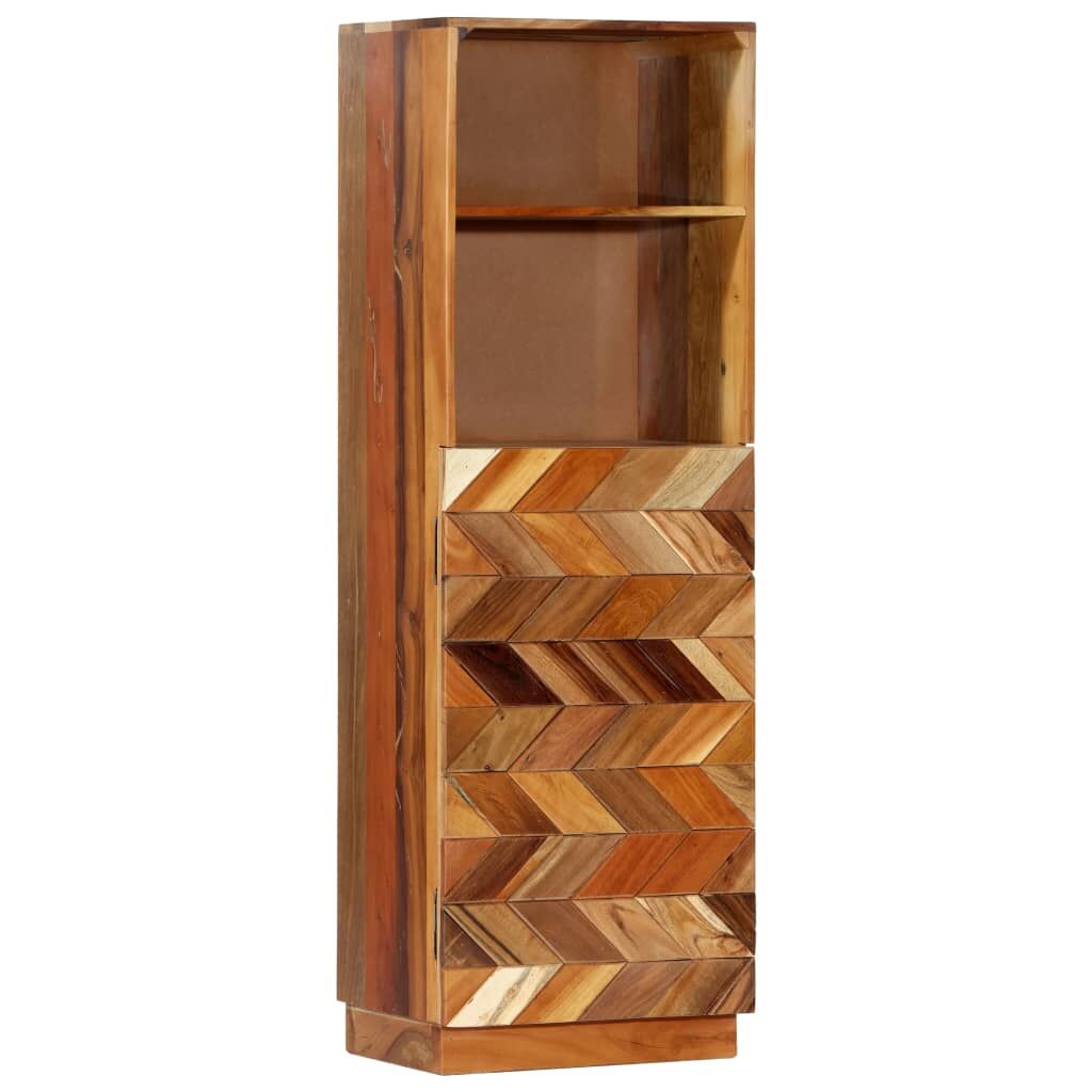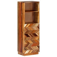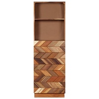 Bring the luxury of mid-century inspired design into your interior with our elegant solid reclaimed wood highboard! Variations in grain and colour give this cabinet a sui generis character. This book cabinet is made of solid reclaimed wood that has been sourced from joists, floors and support beams from old buildings being demolished, and it can consist of different types of wood like pine, teak, beech, oak, cedar, mango wood, acacia, etc. This means the reclaimed wood retains the characteristics of these different types of wood. Reclaimed wood is already aged, weathered and dried, so it doesn't shrink or bend. Every step of the process is carried out with the greatest care, be it polishing or lacquering. The exquisite craftsmanship and the graceful wood grains make every piece of furniture distinctive and slightly different from the next. Additionally, this wooden cabinet is distinguished by 1 door and 2 shelves, offering an ideal solution for displaying and storing your books, magazines, photo frames, collectables as well as other smaller items. The highboard is easy to assemble. Important note: Colours and wood grains vary from piece to piece, making each of our cabinet unique. The delivery is random, ensuring the exclusivity and individuality of your product.