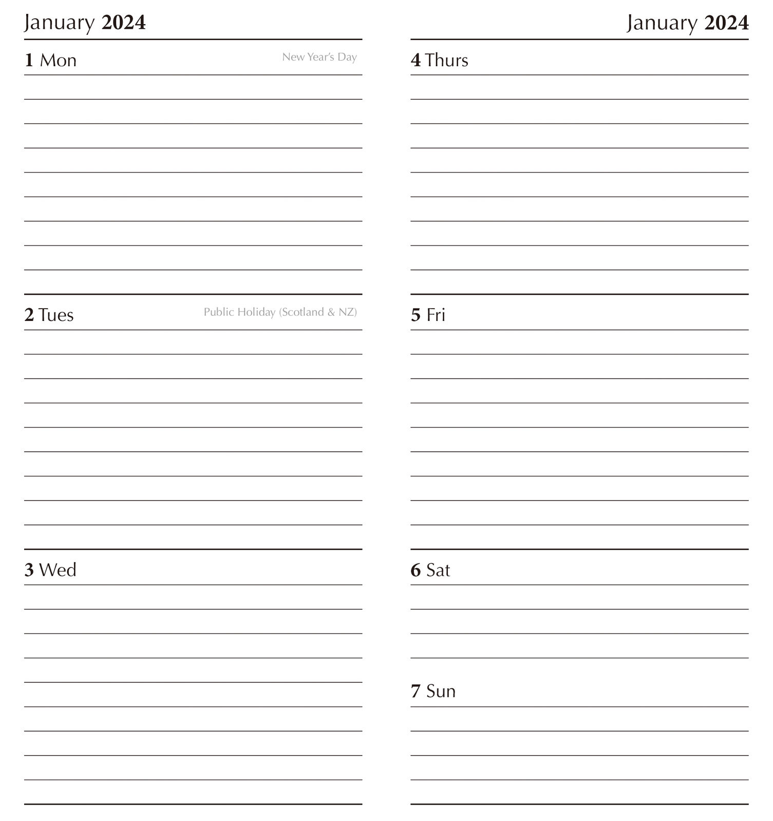 • Format: Week To View (from Monday through to Sunday in two pages)