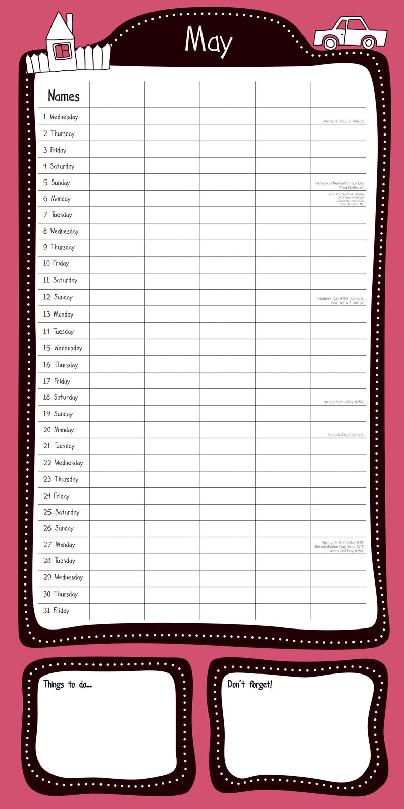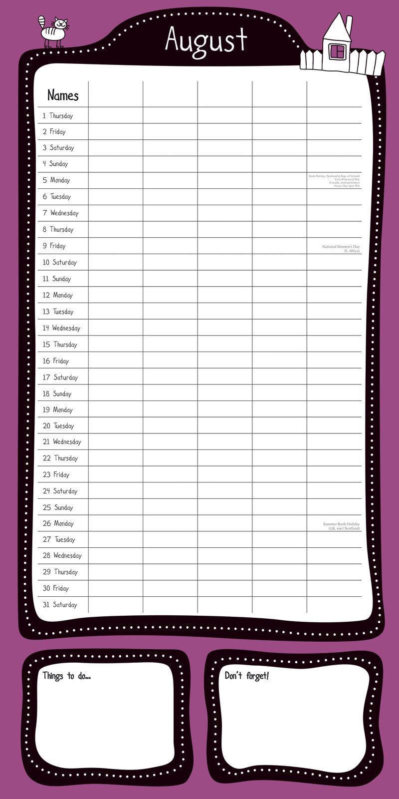 • Public Holidays and major religious dates are marked for Australia, New Zealand, UK, USA, Canada, Japan, and South Africa