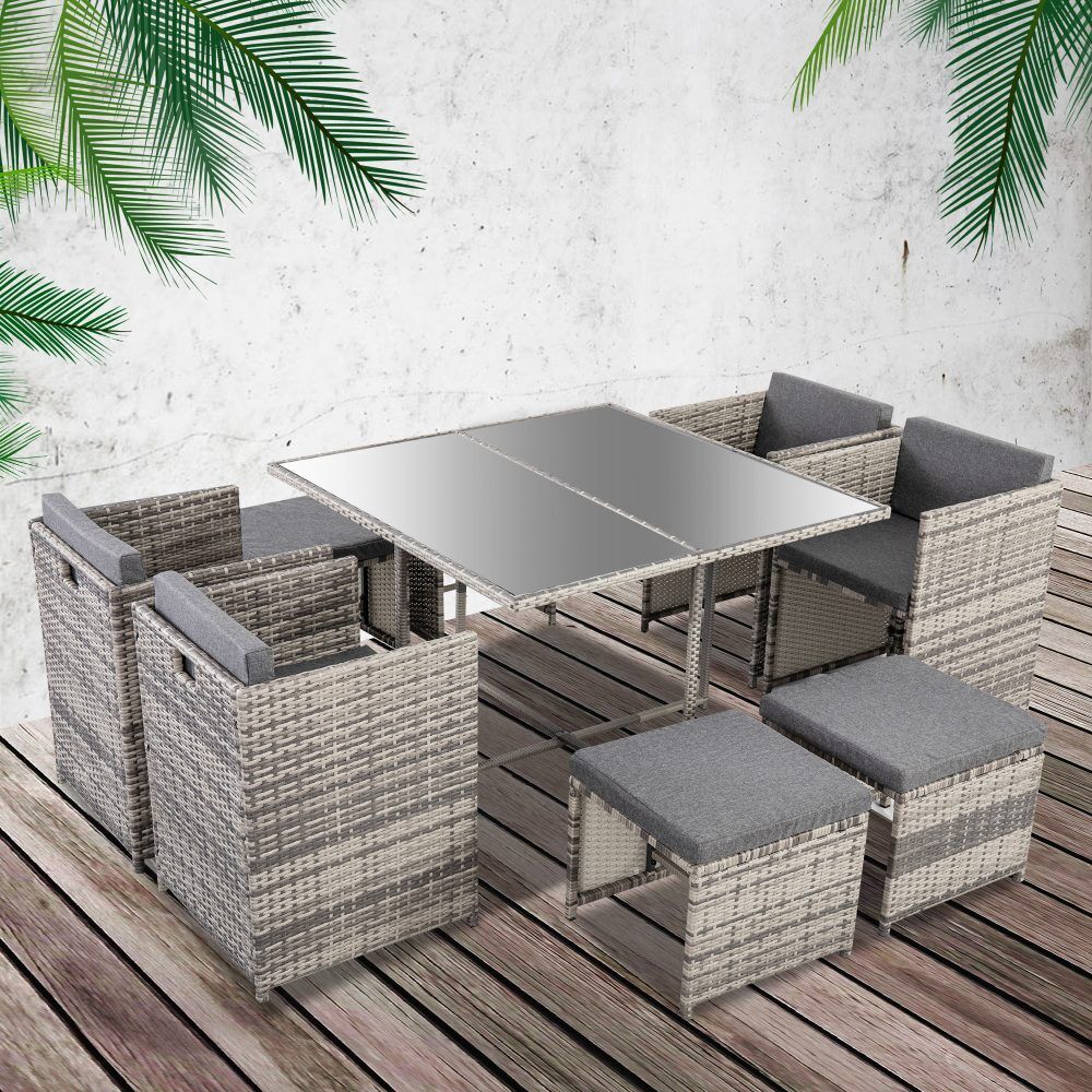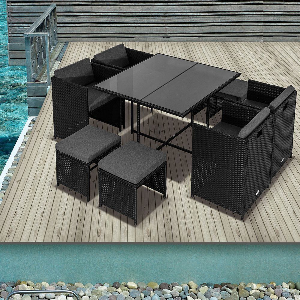 $1,197.55This rattan garden furniture oozes style while offering a beautiful simplicity. The nine-piece dining set can become the focal point of your patio area or garden, suiting a broad variety of backyard arrangements and garden landscapes. Benefit from the contemporary coolness of rattan, as well as its durability and lightweight. Transform your outdoor living space with this superb modern minimalist furniture collection.