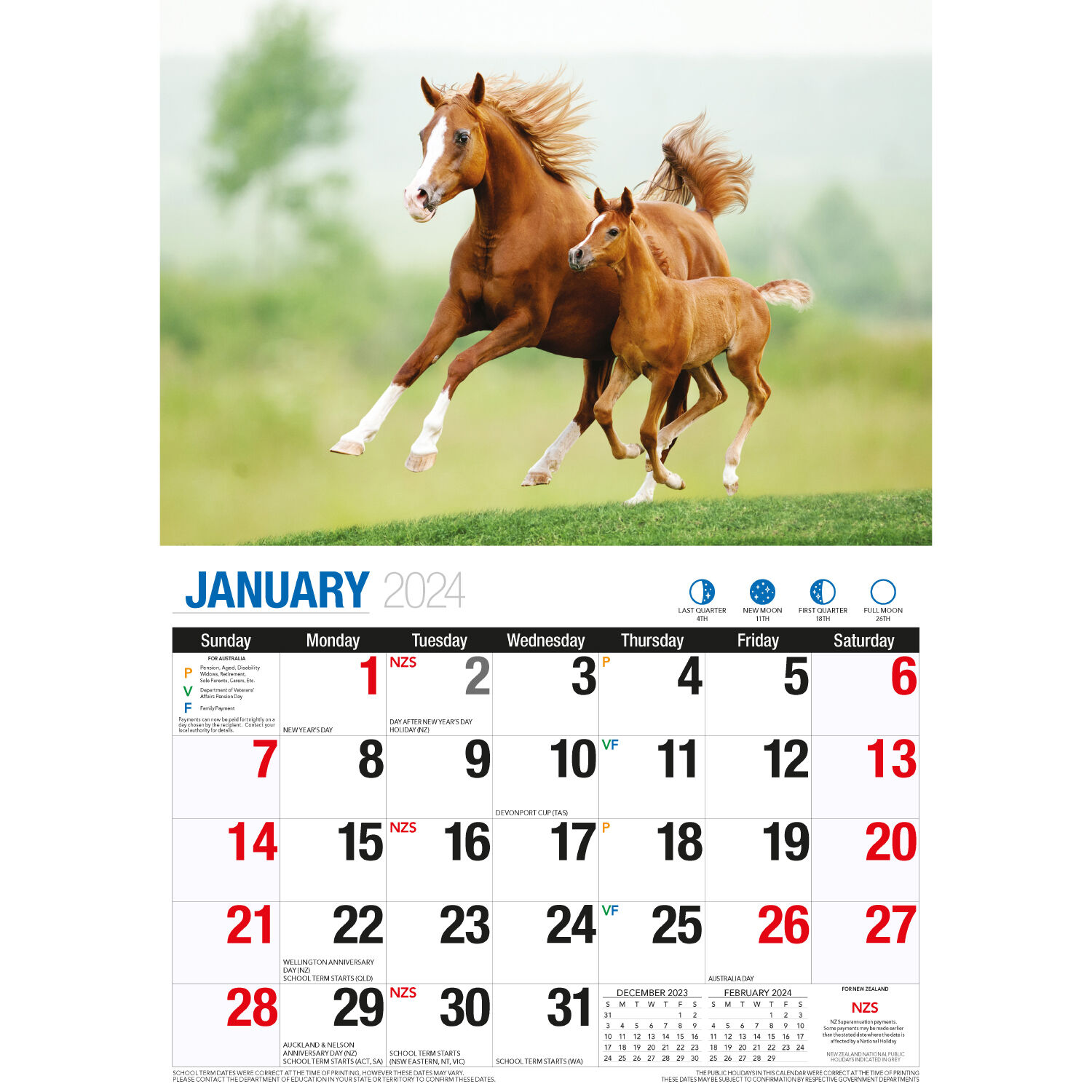 • Public Holidays, pension dates, and school terms for Australia and New Zealand are marked on the calendar.