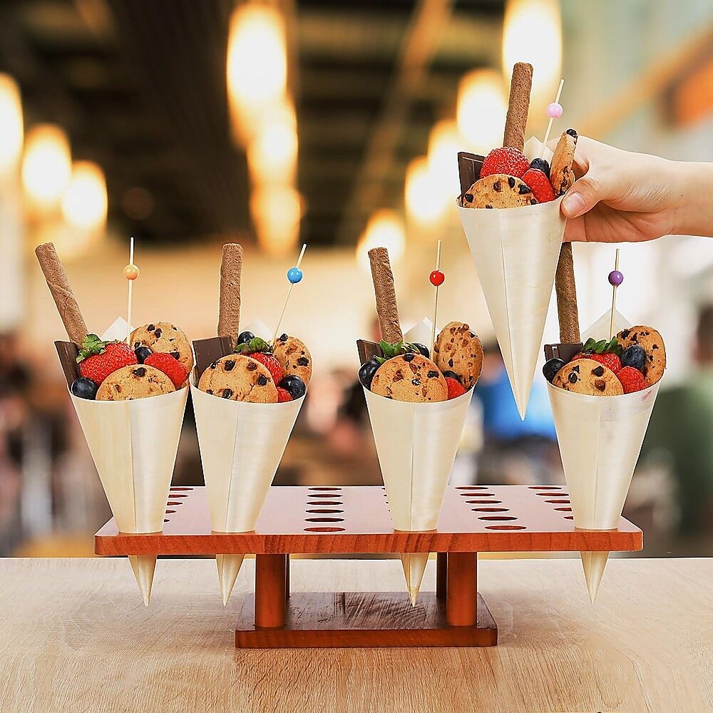 This versatile holder is perfect for displaying cones, waffles, sushi hand rolls, cupcakes, and more, making it suitable for various occasions.Designed with a stable base, this wooden stand can hold up to 36 cones, providing excellent balance and stability for your treats.Ideal for birthdays, parties, weddings, holiday decorations, anniversaries, and more, this food cone stand adds a pleasant and festive atmosphere to any event.: Use this holder as a decorative display for weddings, restaurants, catering events, buffets, birthday parties, and other celebrations.